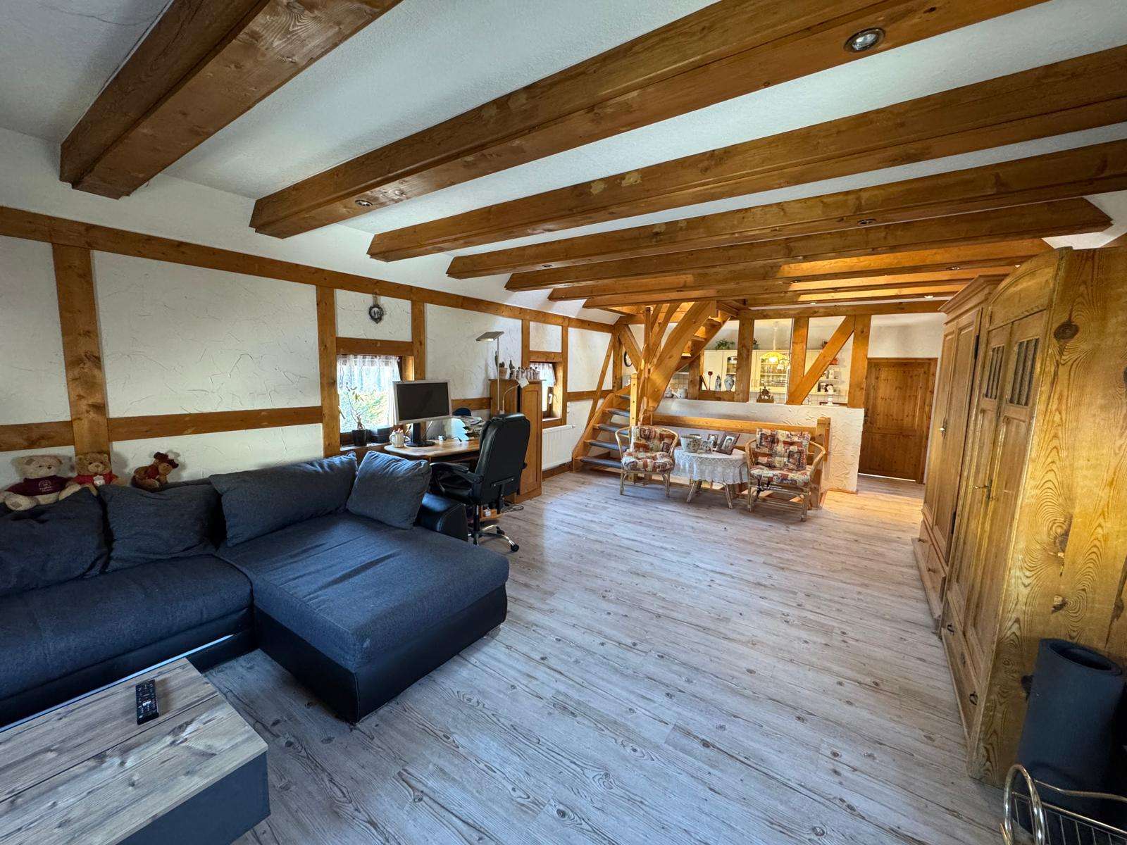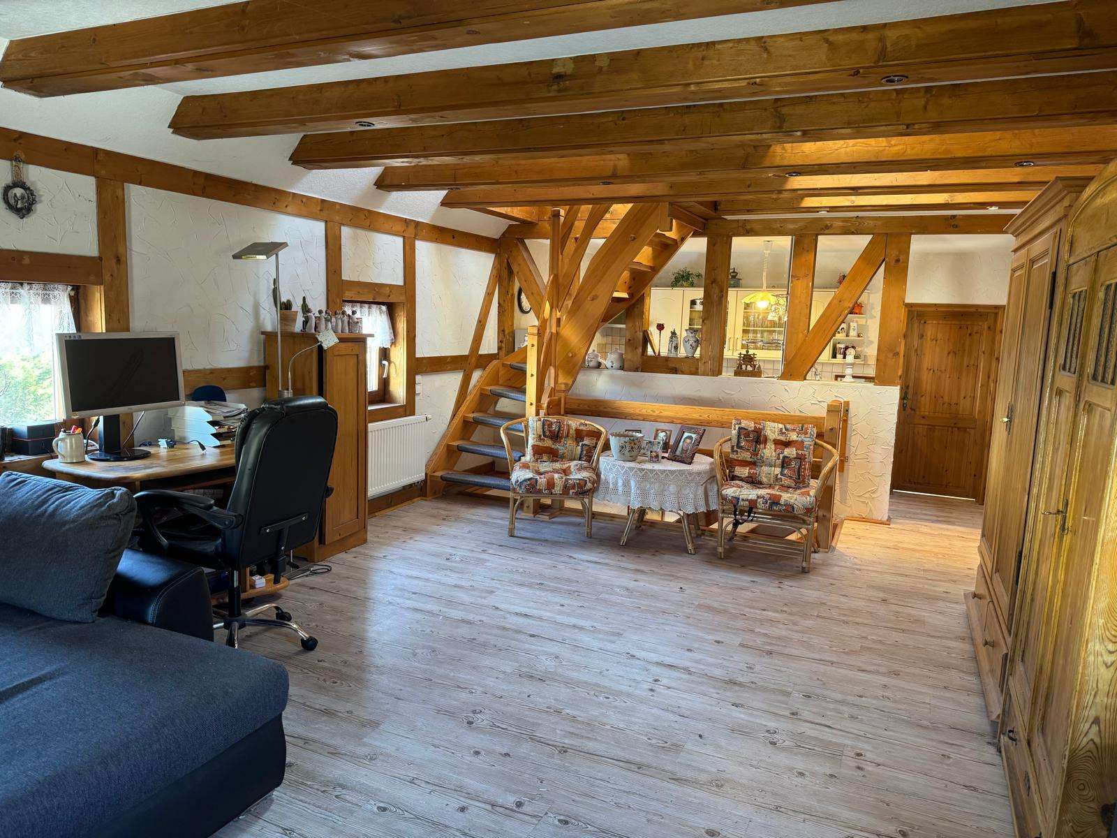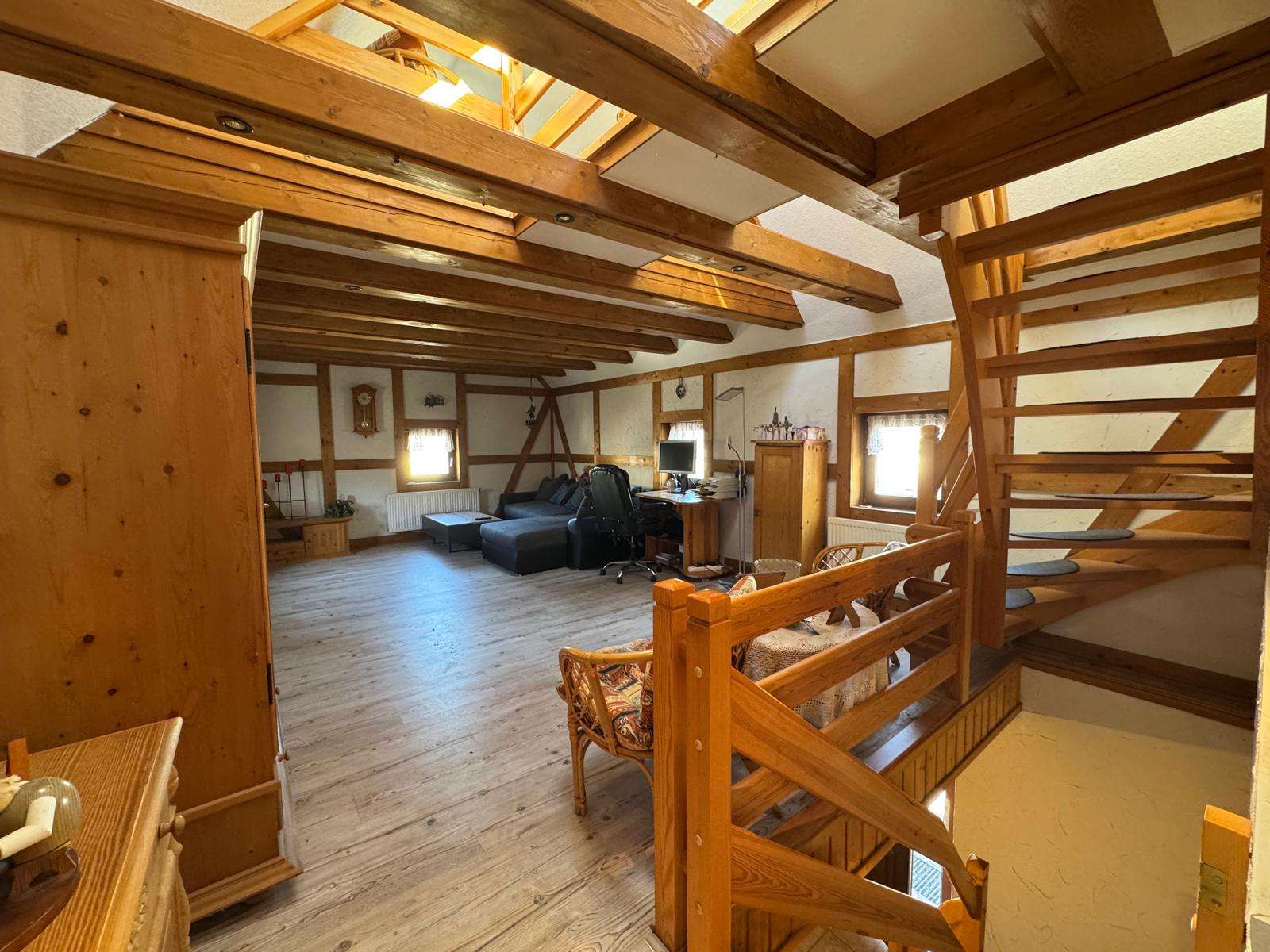 Über eine Holztreppe erreichen Sie das Obergeschoss, dieses besteht aus einem großen Wohnzimmer mit Küche, welches sich fast über die gesamte Etage erstreckt. Ein Schlafzimmer mit separatem WC ist ebenfalls vorhanden. Dieses Etage besticht besonders durch das offene Wohnklima in Verbindung mit den freilegenden Holzbalken. Von hier führt eine Treppe ins ausgebaute Dachgeschoss, hier befindet sich ein Schlafbereich und ein bisher noch nicht ausgebautes Zimmer. Hier kann weiterer Schlafraum entstehen, jedoch ist hier die niedrige Deckenhöhe zu beachten.