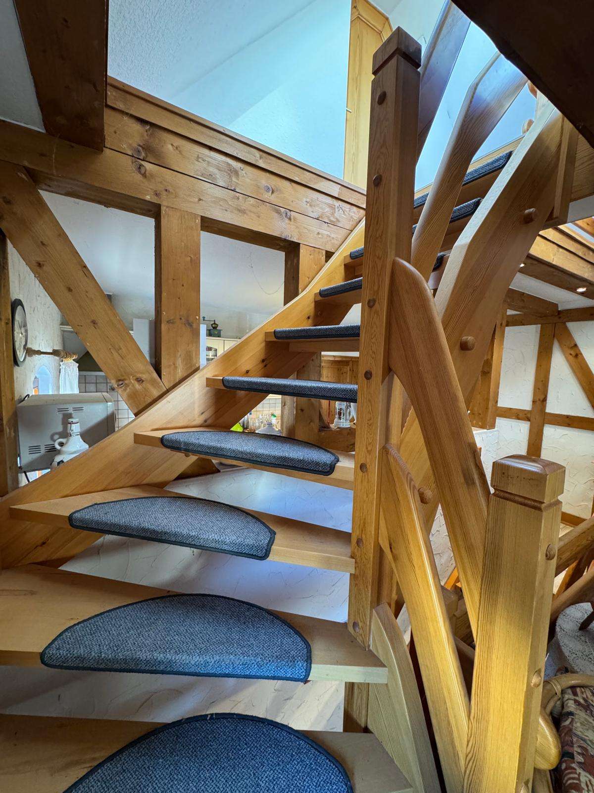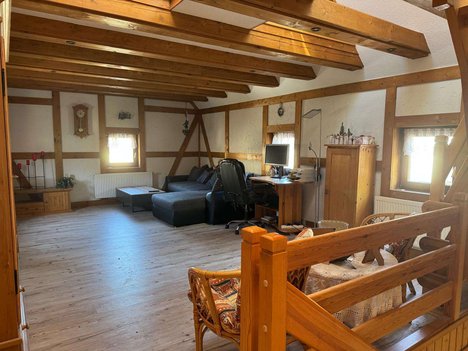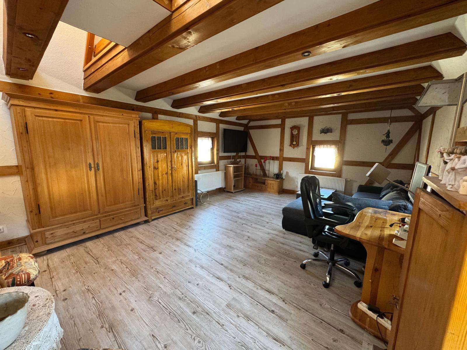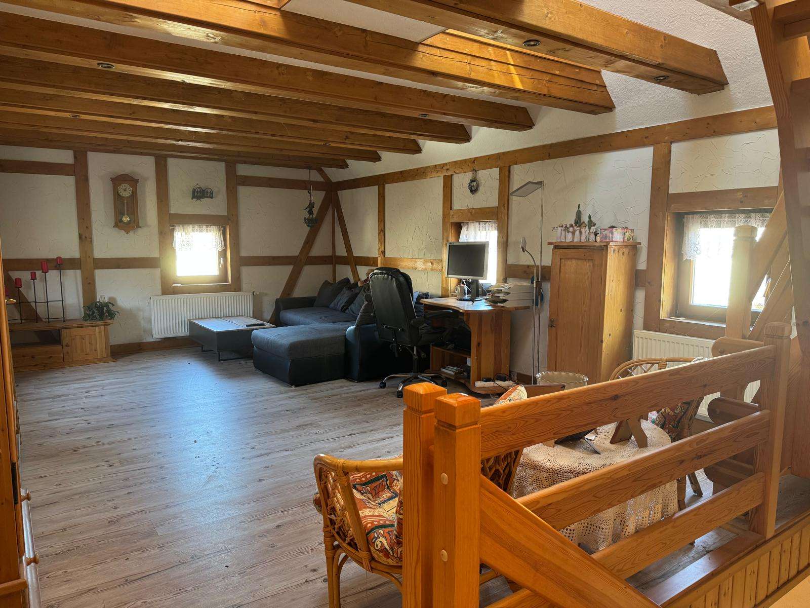 Über eine Holztreppe erreichen Sie das Obergeschoss, dieses besteht aus einem großen Wohnzimmer mit Küche, welches sich fast über die gesamte Etage erstreckt. Ein Schlafzimmer mit separatem WC ist ebenfalls vorhanden. Dieses Etage besticht besonders durch das offene Wohnklima in Verbindung mit den freilegenden Holzbalken. Von hier führt eine Treppe ins ausgebaute Dachgeschoss, hier befindet sich ein Schlafbereich und ein bisher noch nicht ausgebautes Zimmer. Hier kann weiterer Schlafraum entstehen, jedoch ist hier die niedrige Deckenhöhe zu beachten.