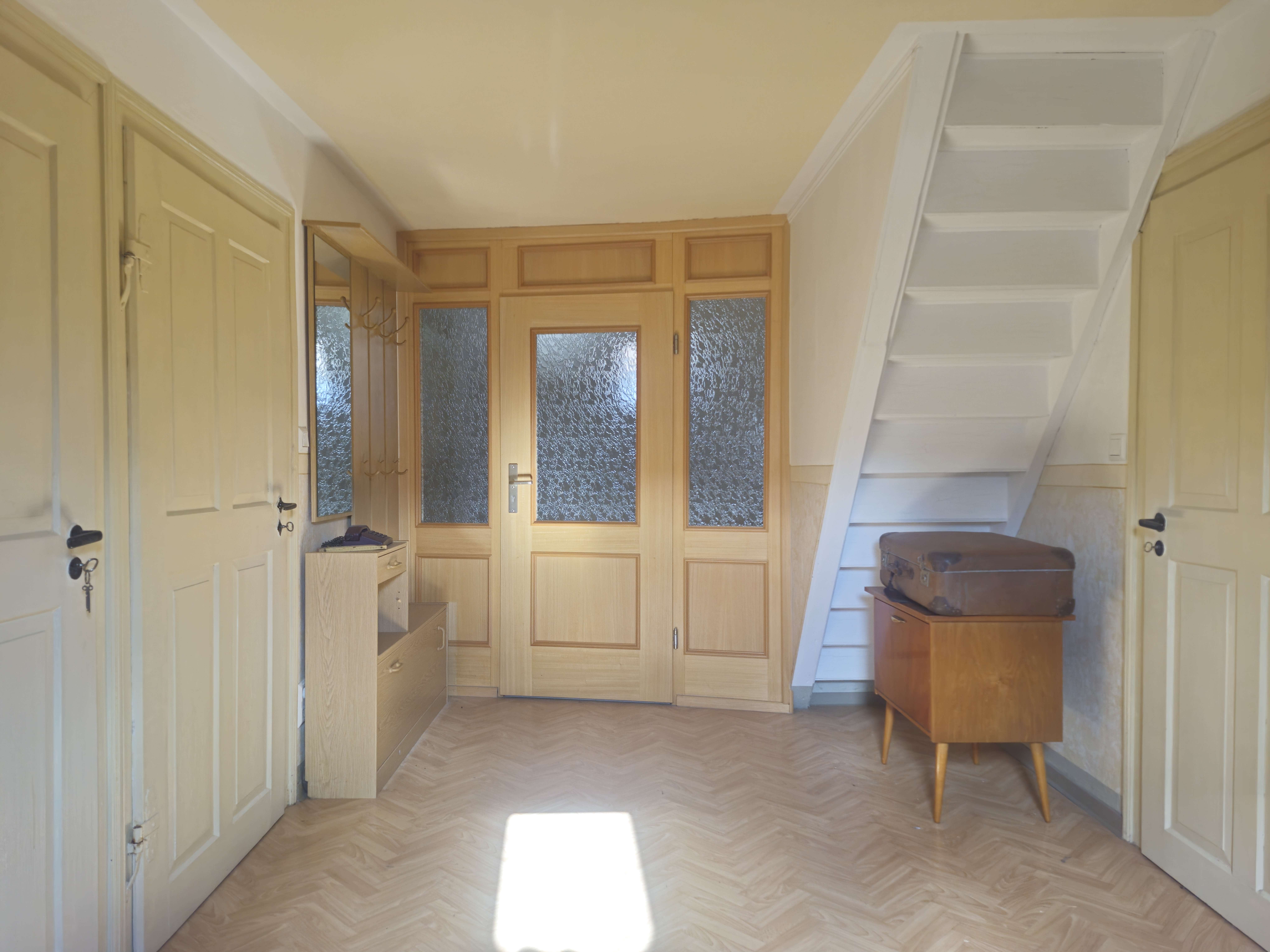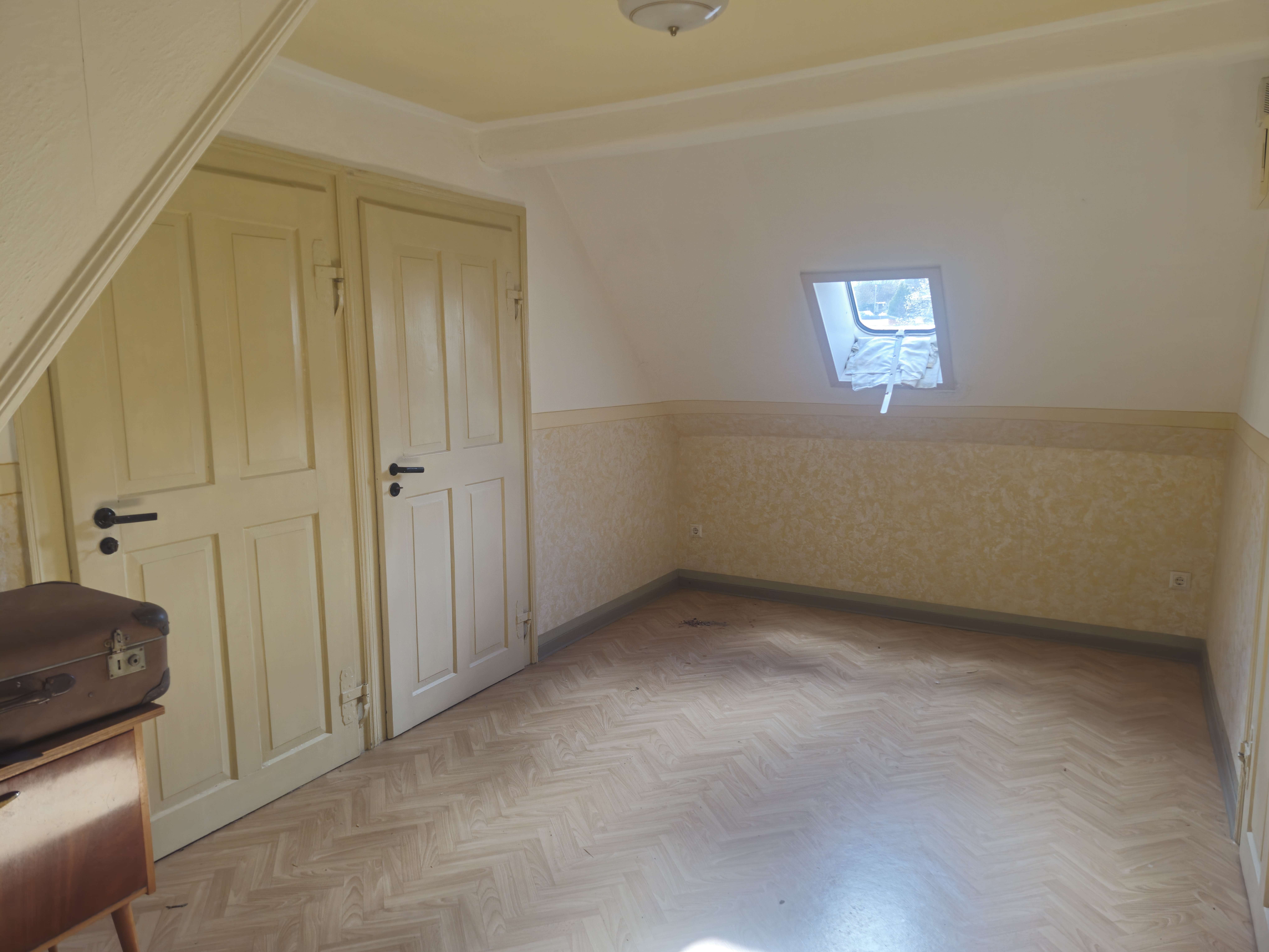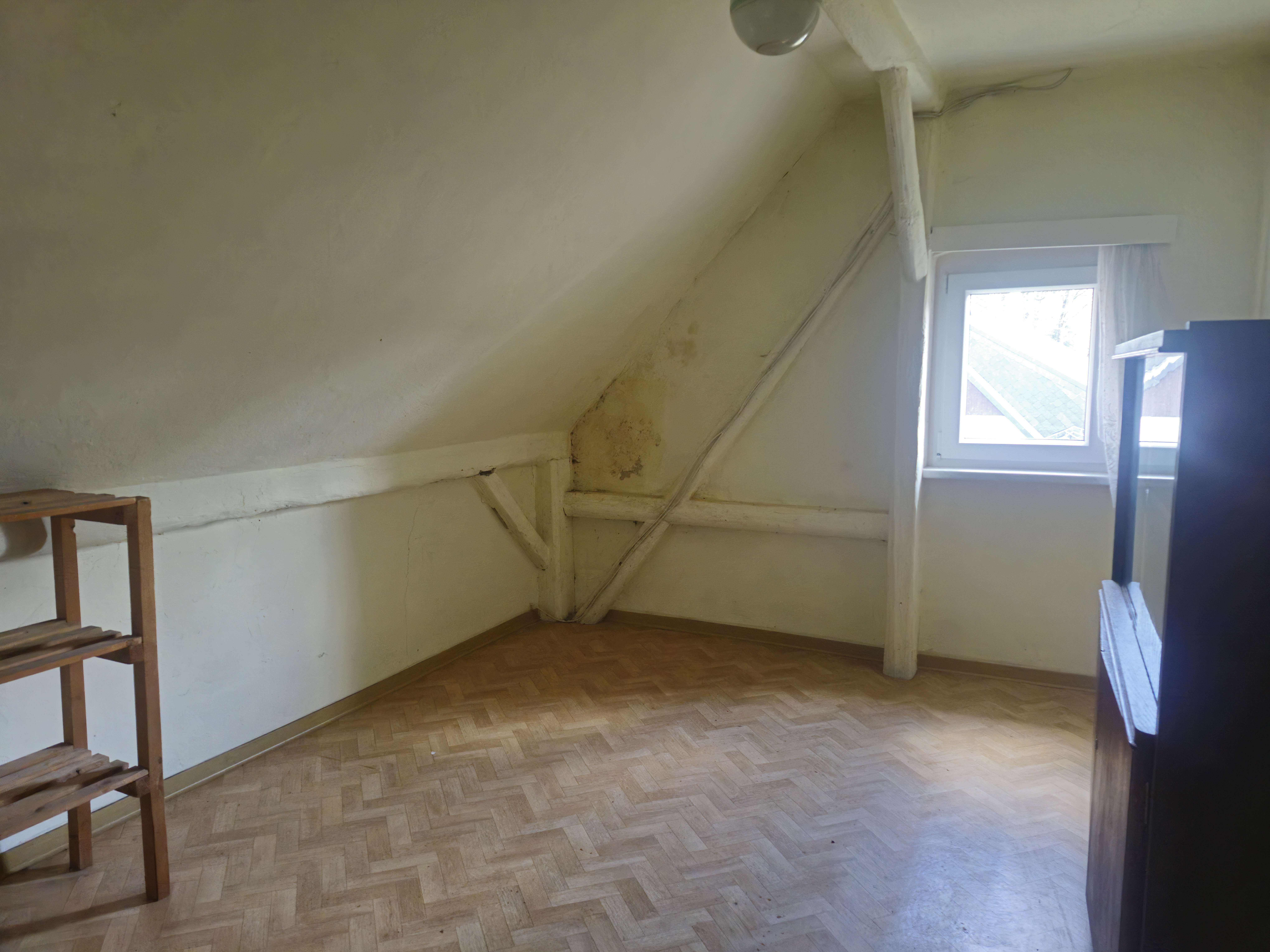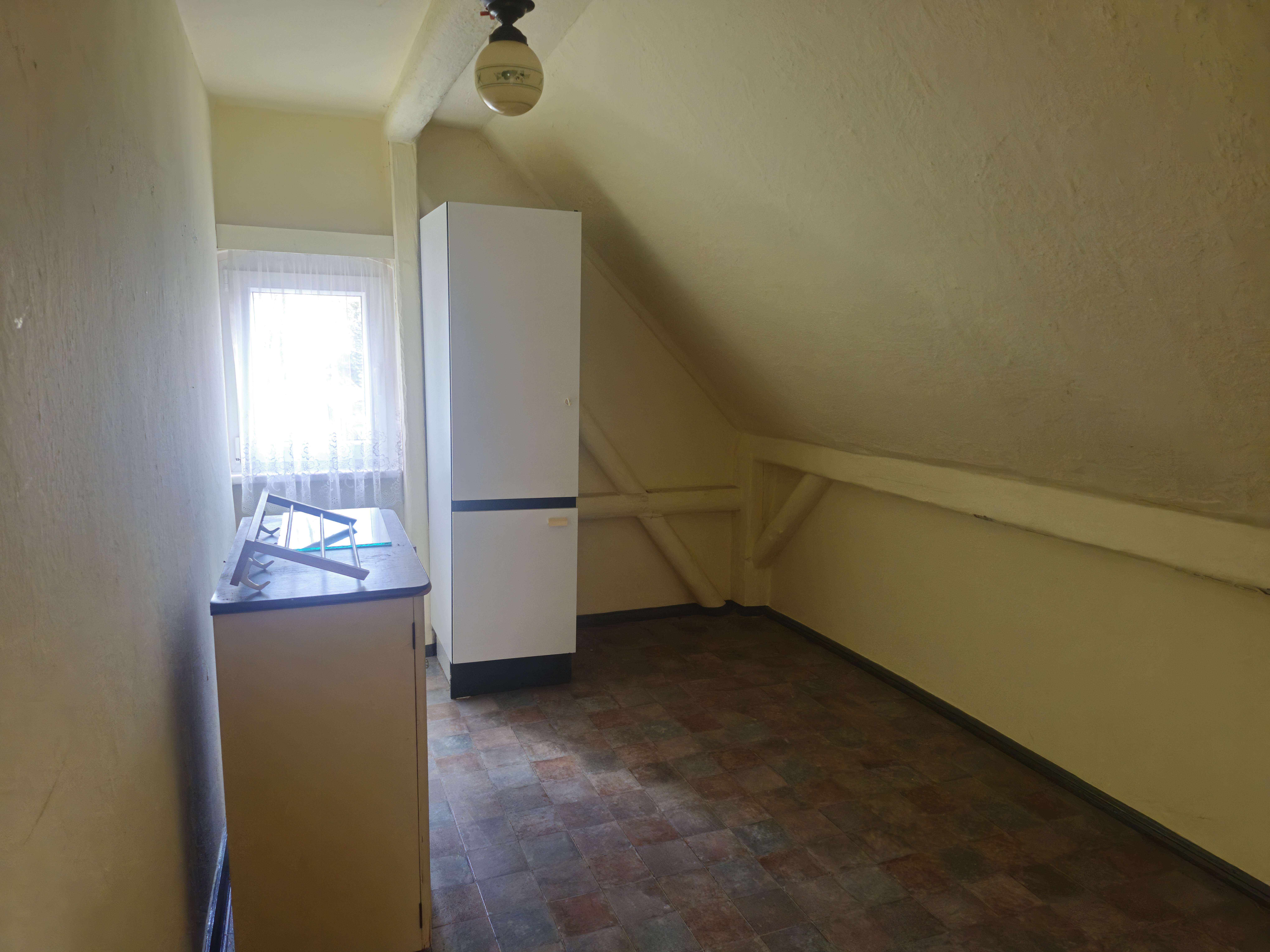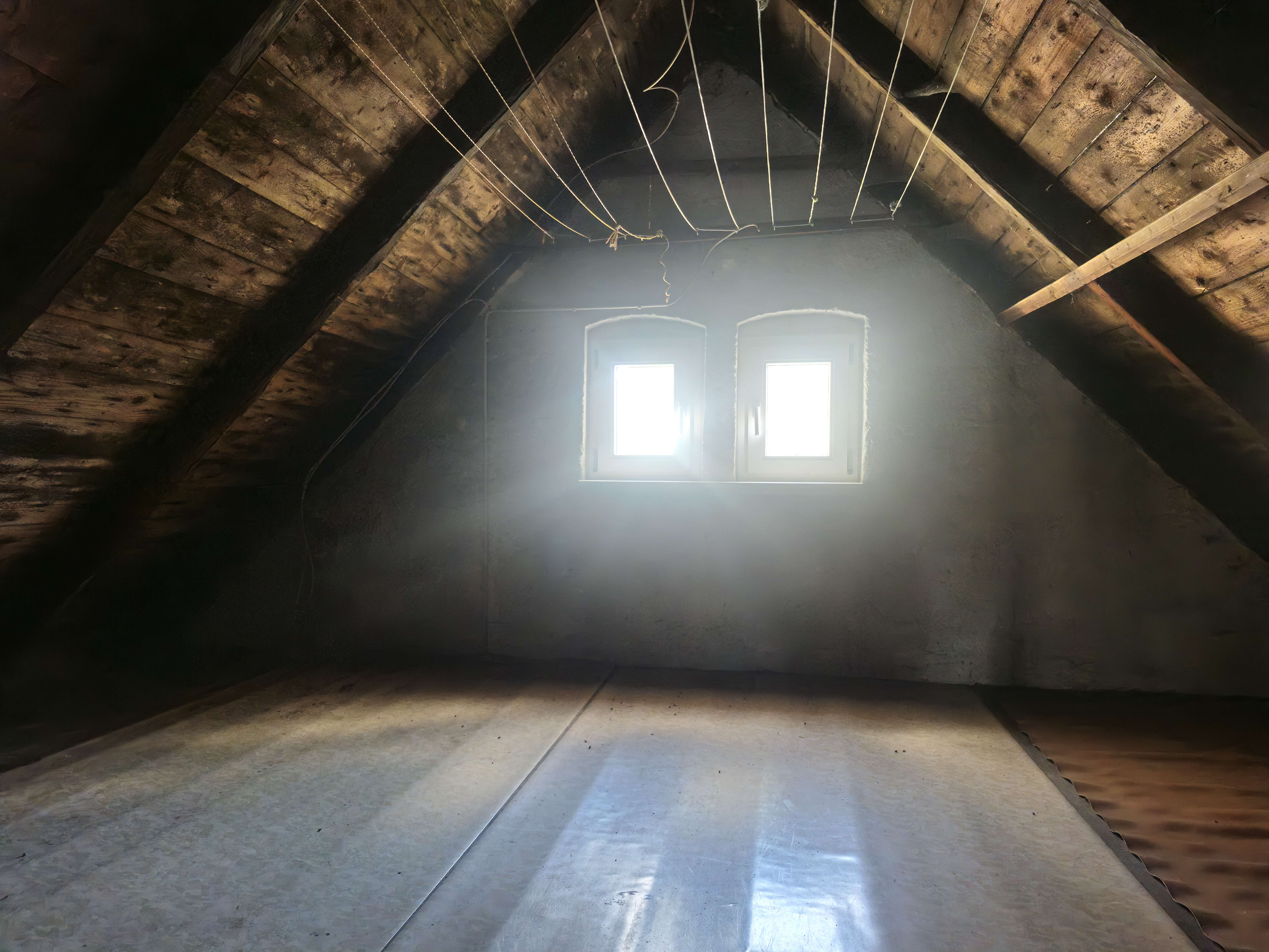 Eine vom Flur aus erreichbare Holztreppe führt in den Dachboden, der bisher als praktische Lagerfläche genutzt wurde und derzeit nicht gedämmt ist.
