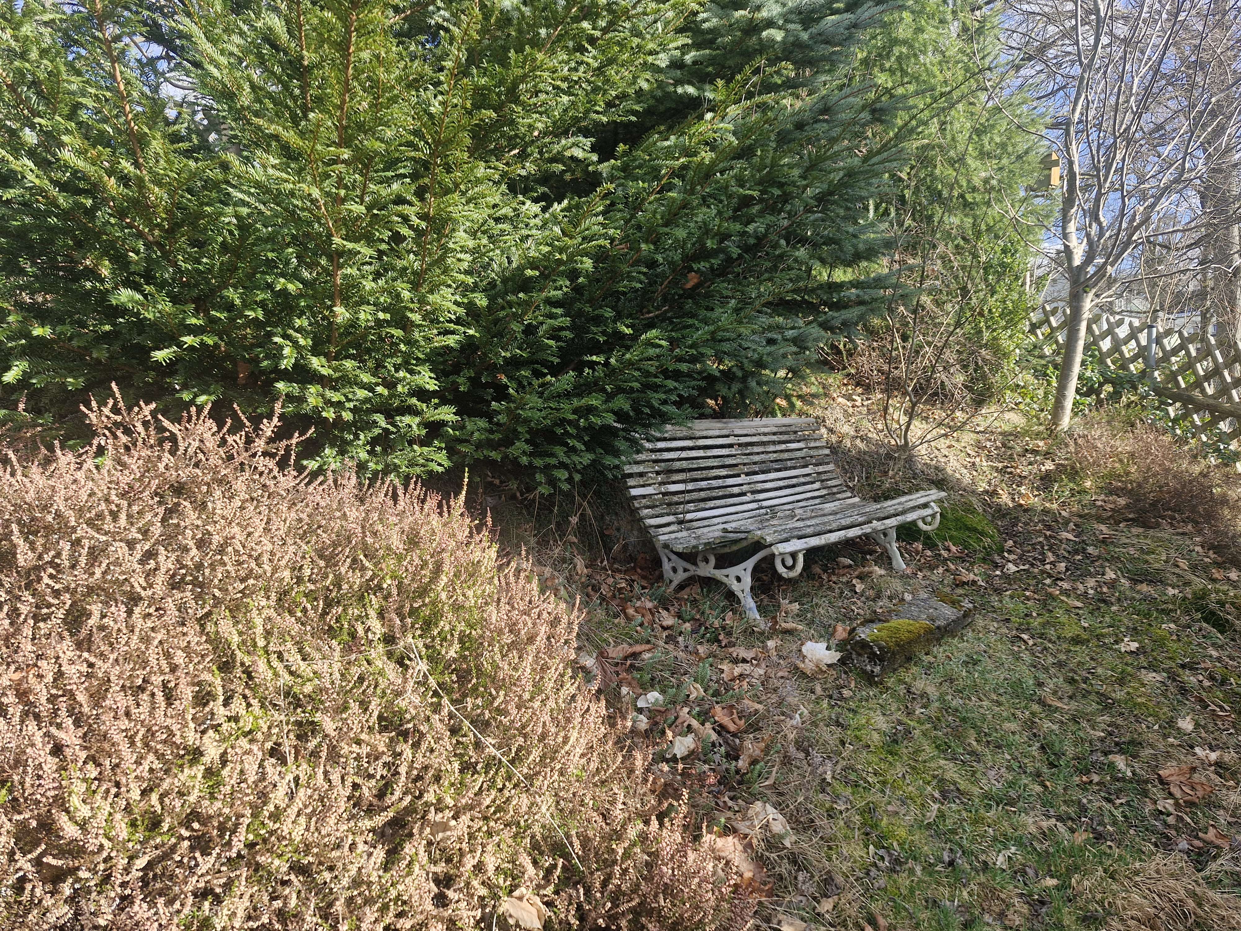 Das etwa 620 m² große Grundstück ist liebevoll angelegt. Bäume und Sträucher verleihen dem Garten eine natürliche Struktur und schaffen eine angenehme Atmosphäre. Ein Schuppen bietet zusätzlichen Platz, beispielsweise für eine kleine Werkstatt oder Gartengeräte.