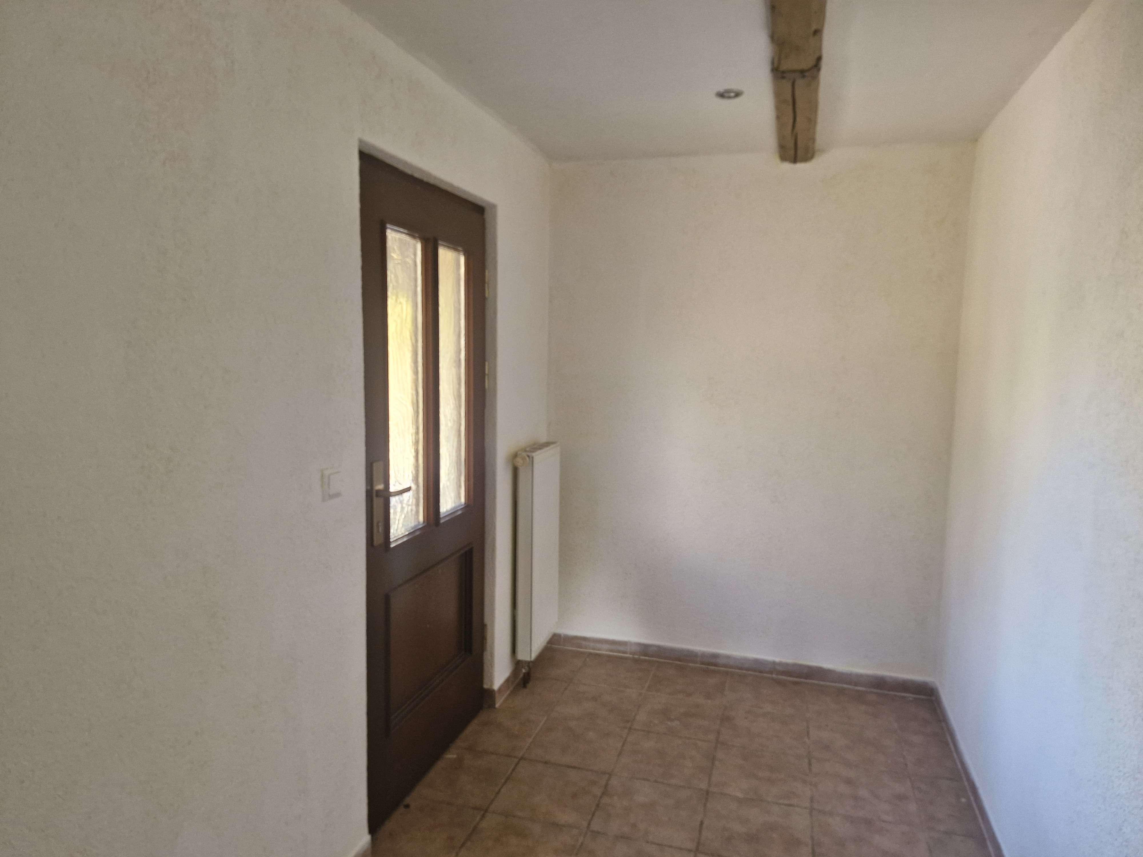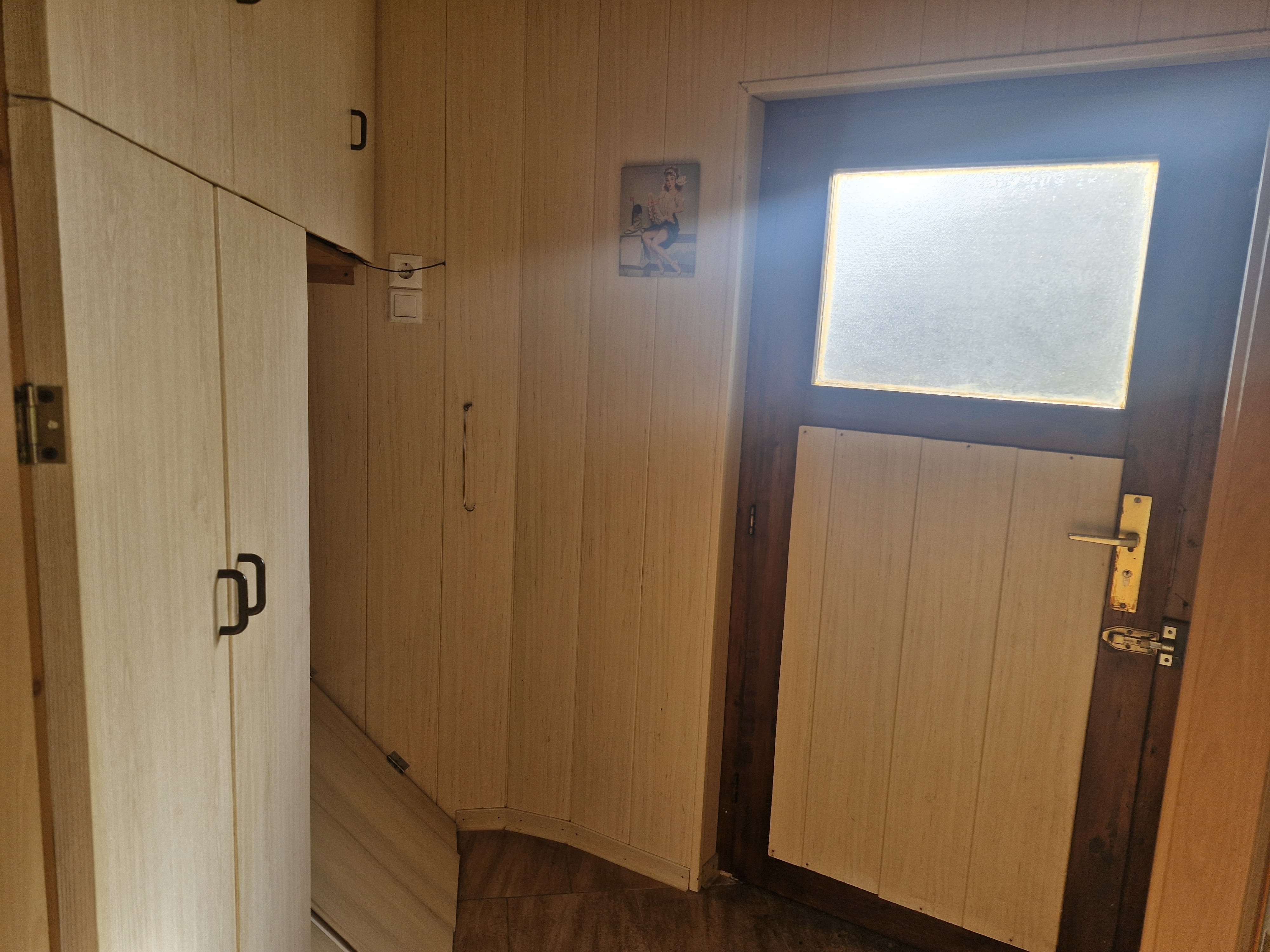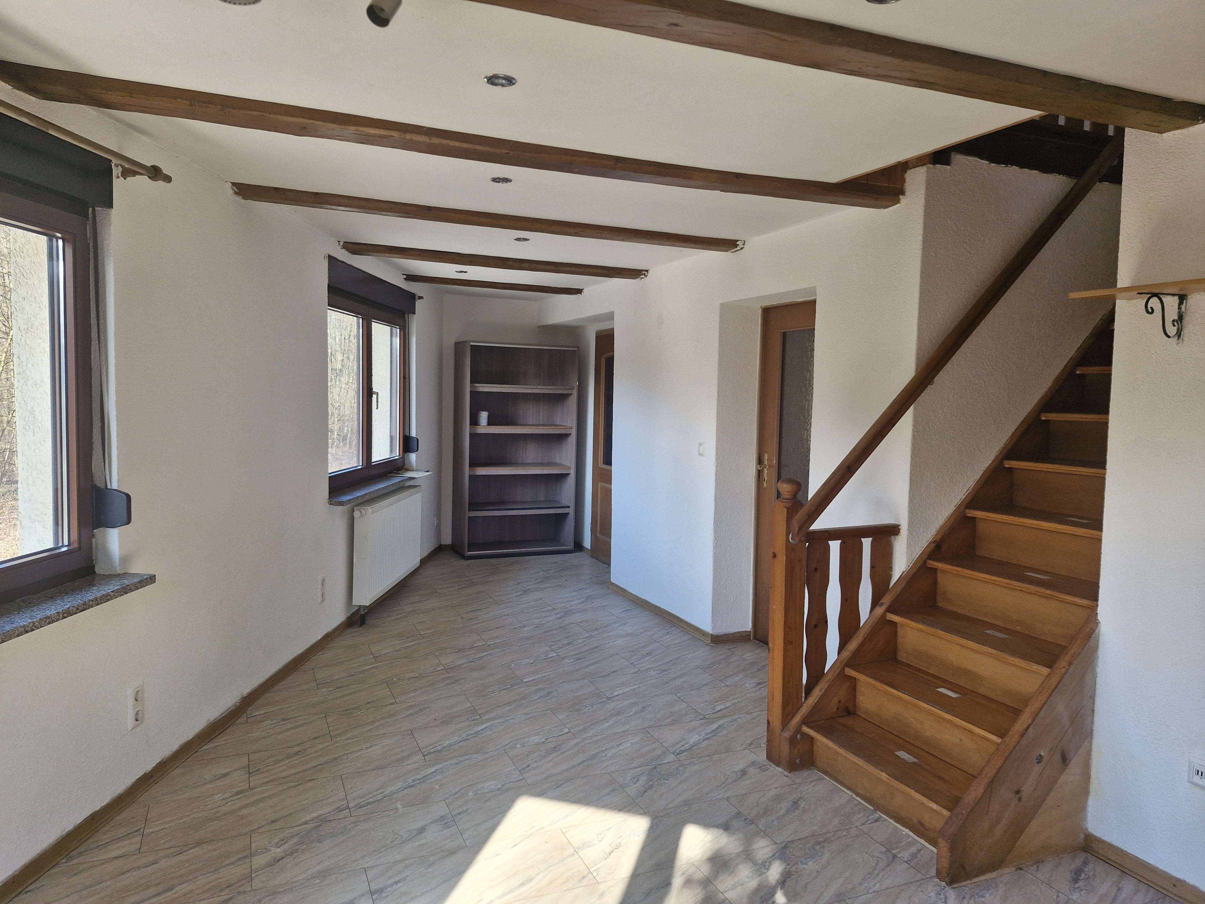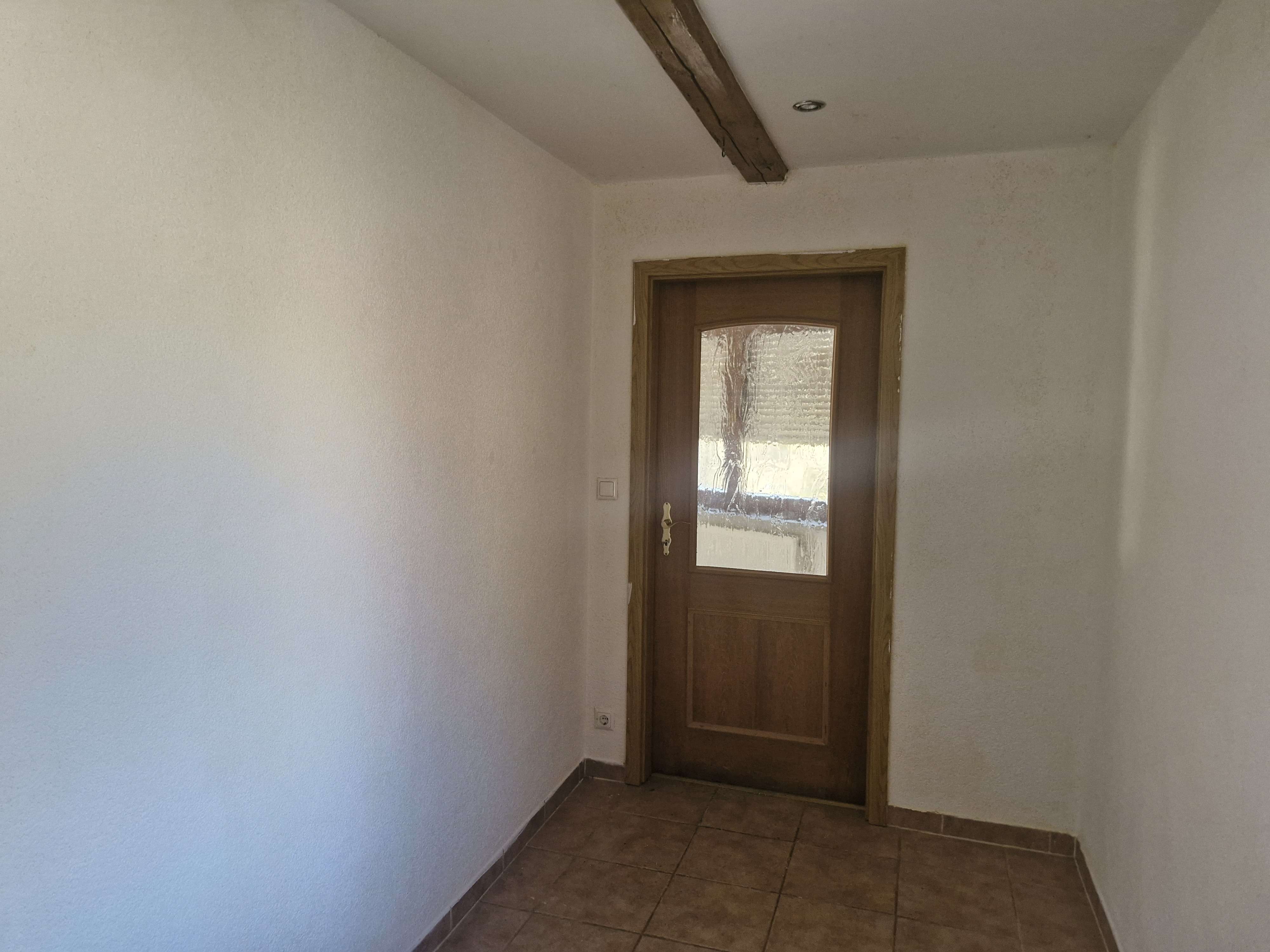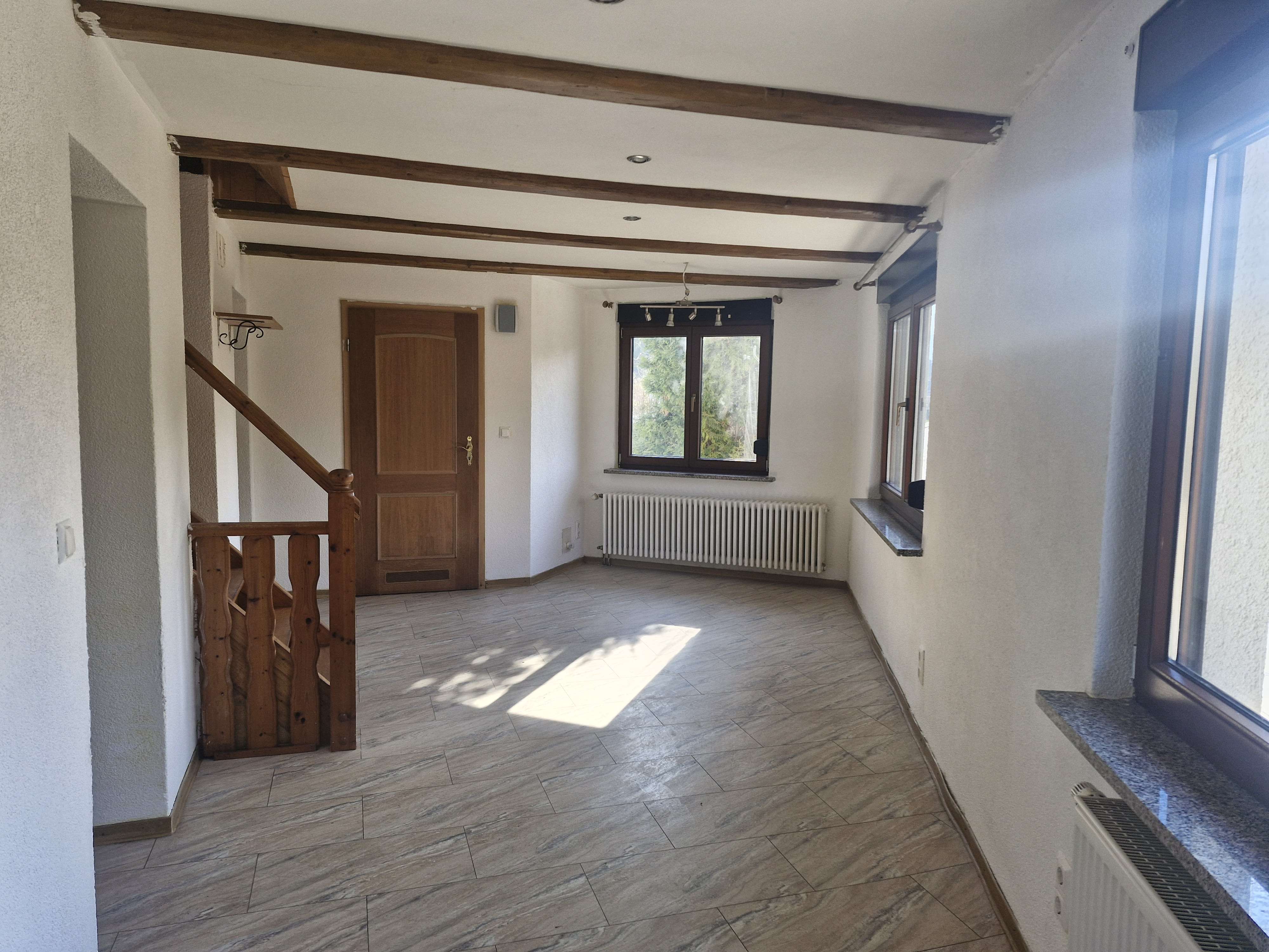 Über wenige Stufen betreten Sie das Haus und gelangen zunächst in den Eingangsbereich, der sich ideal als Garderobe nutzen lässt. Von hier aus erreichen Sie den großzügigen Flur, von dem sowohl das Wohnzimmer als auch die Küche zugänglich sind.