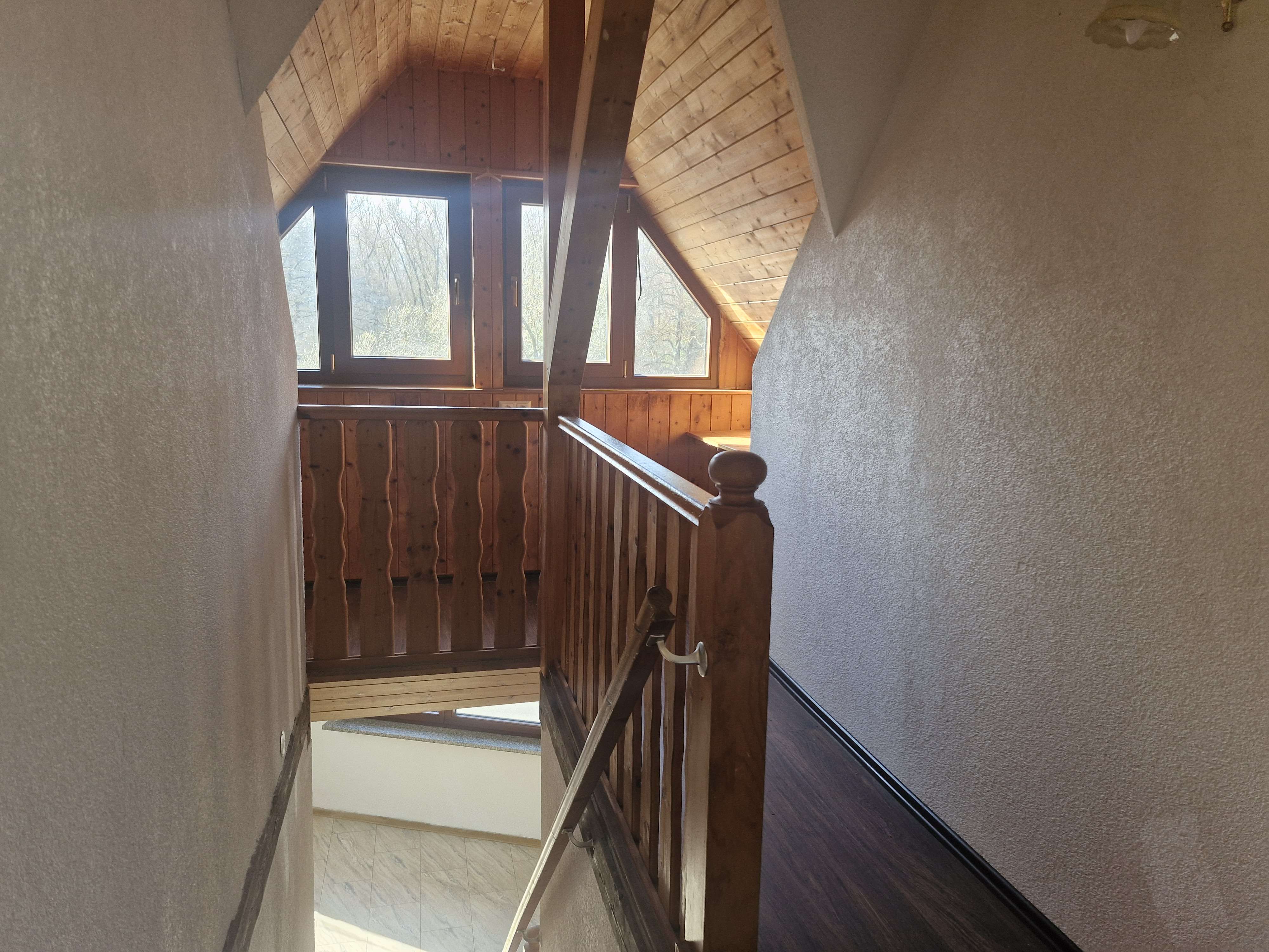 Über eine Holztreppe gelangen Sie vom Flur in das Obergeschoss. Hier befinden sich auf der rechten Seite das Elternschlafzimmer und auf der linken Seite ein Kinderzimmer mit angrenzendem Balkon.