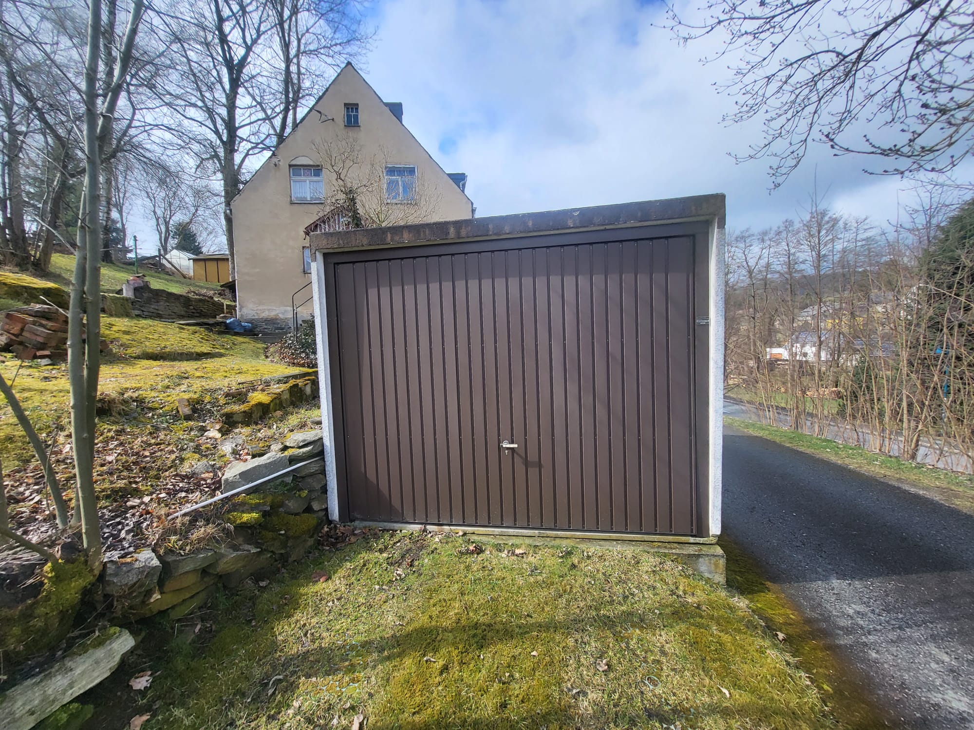 Über eine kleine Zufahrt von der Hauptstraße erreicht man das sonnige Grundstück. Das große, leicht hangige Grundstück bietet eine große Rasenfläche und ist mit altem Baumbestand und Büschen teilweise bewachsen. Eine kleine Terrasse bietet Platz für gemütliche Grillabende mit der Familie oder dem Tagesausklang mit einem kühlen Bier. Für die Kinder gibt es ausreichend Platz zum Spielen und Toben. Auch für Blumenbeete oder den Anbau von Nutzpflanzen zur eigenen Versorgung ist genügend Fläche vorhanden. Eine PKW-Garage und ein kleiner Schuppen zum Abstellen von Gartengeräten und -möbeln runden das Grundstück ab.