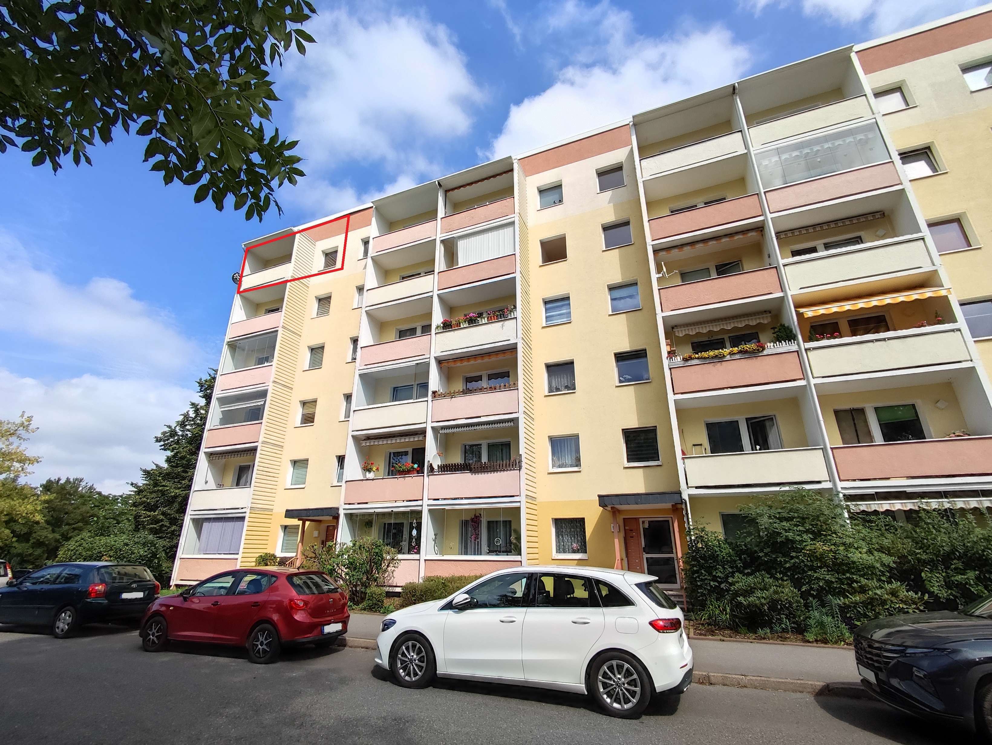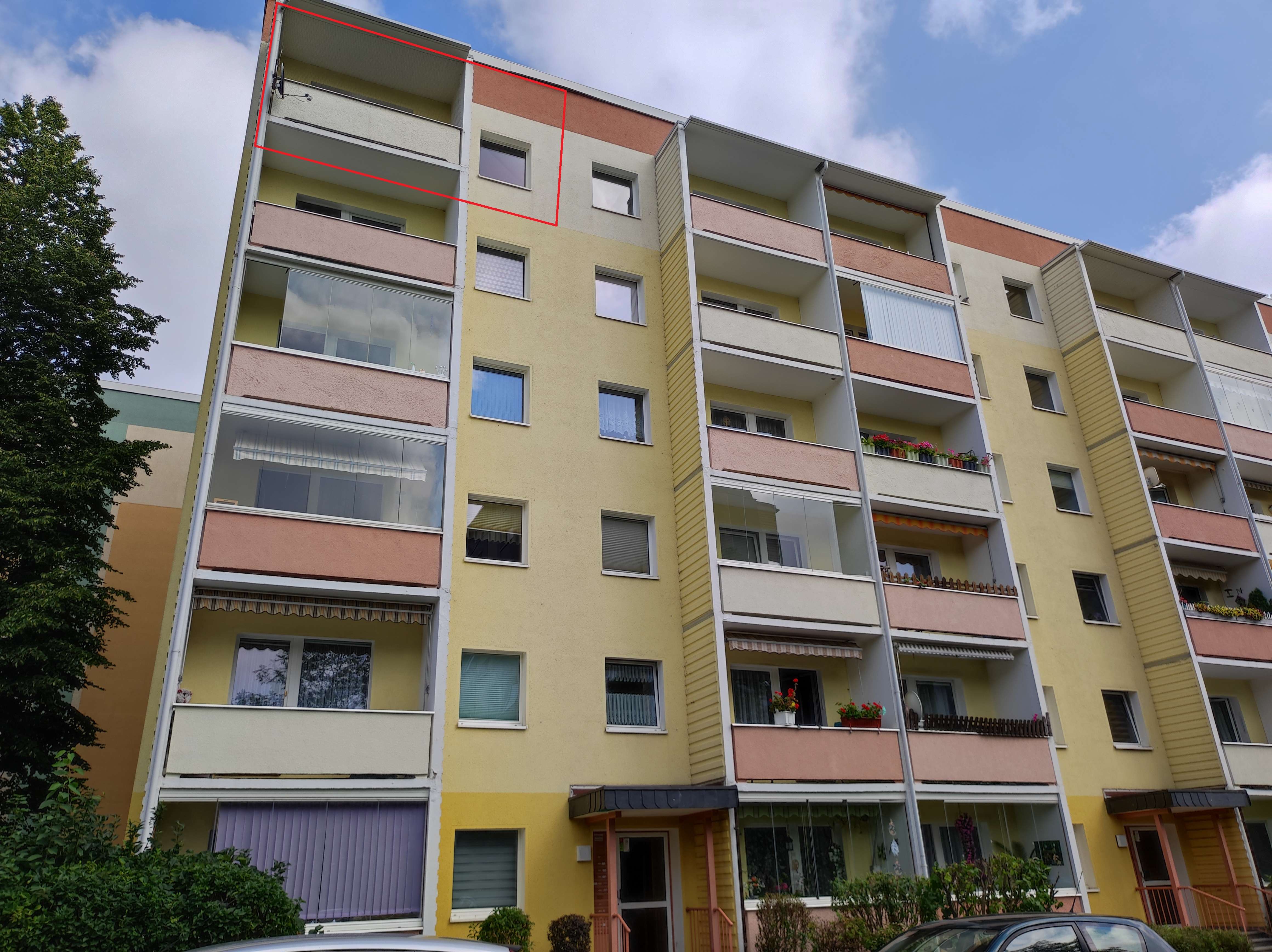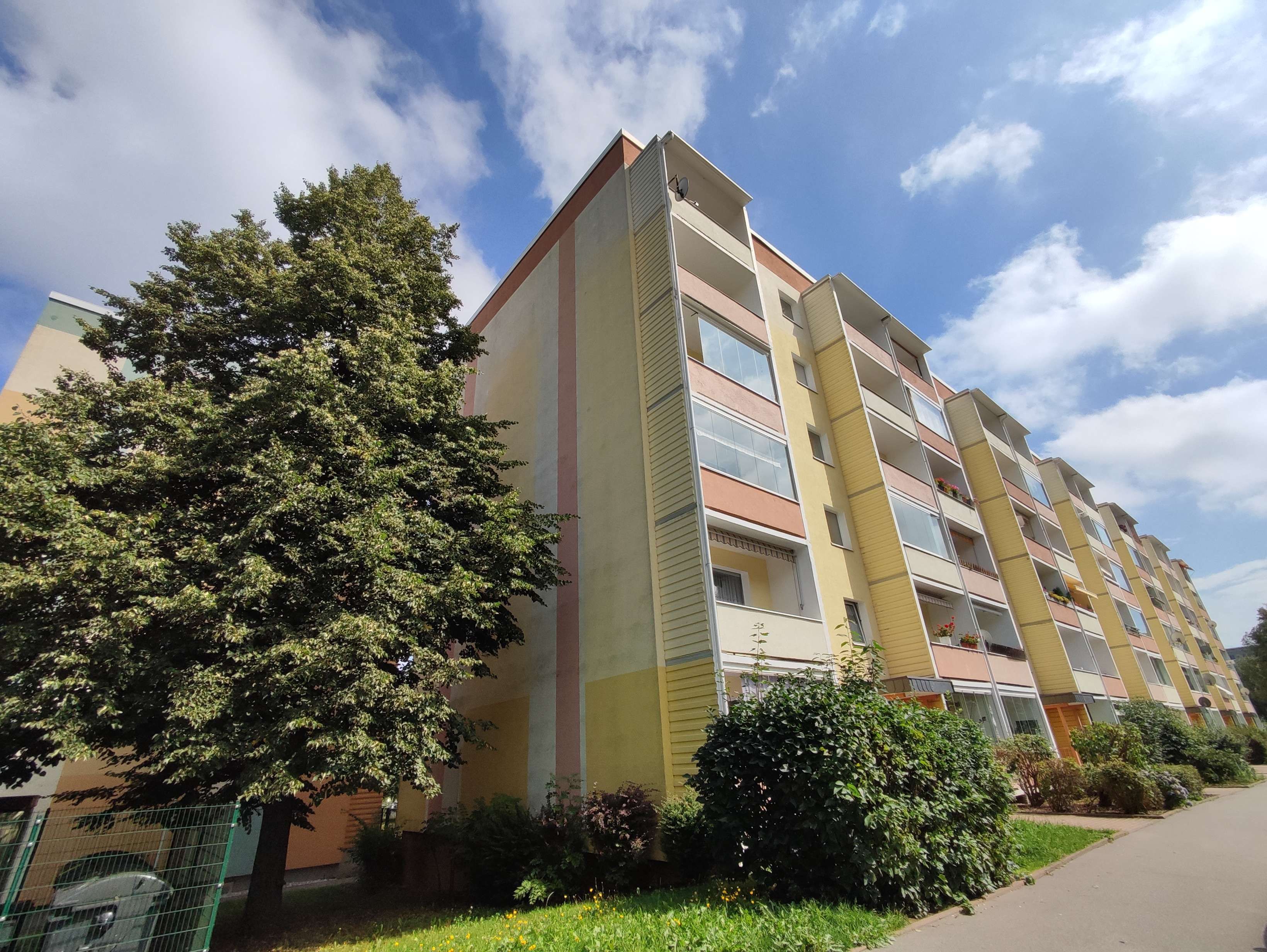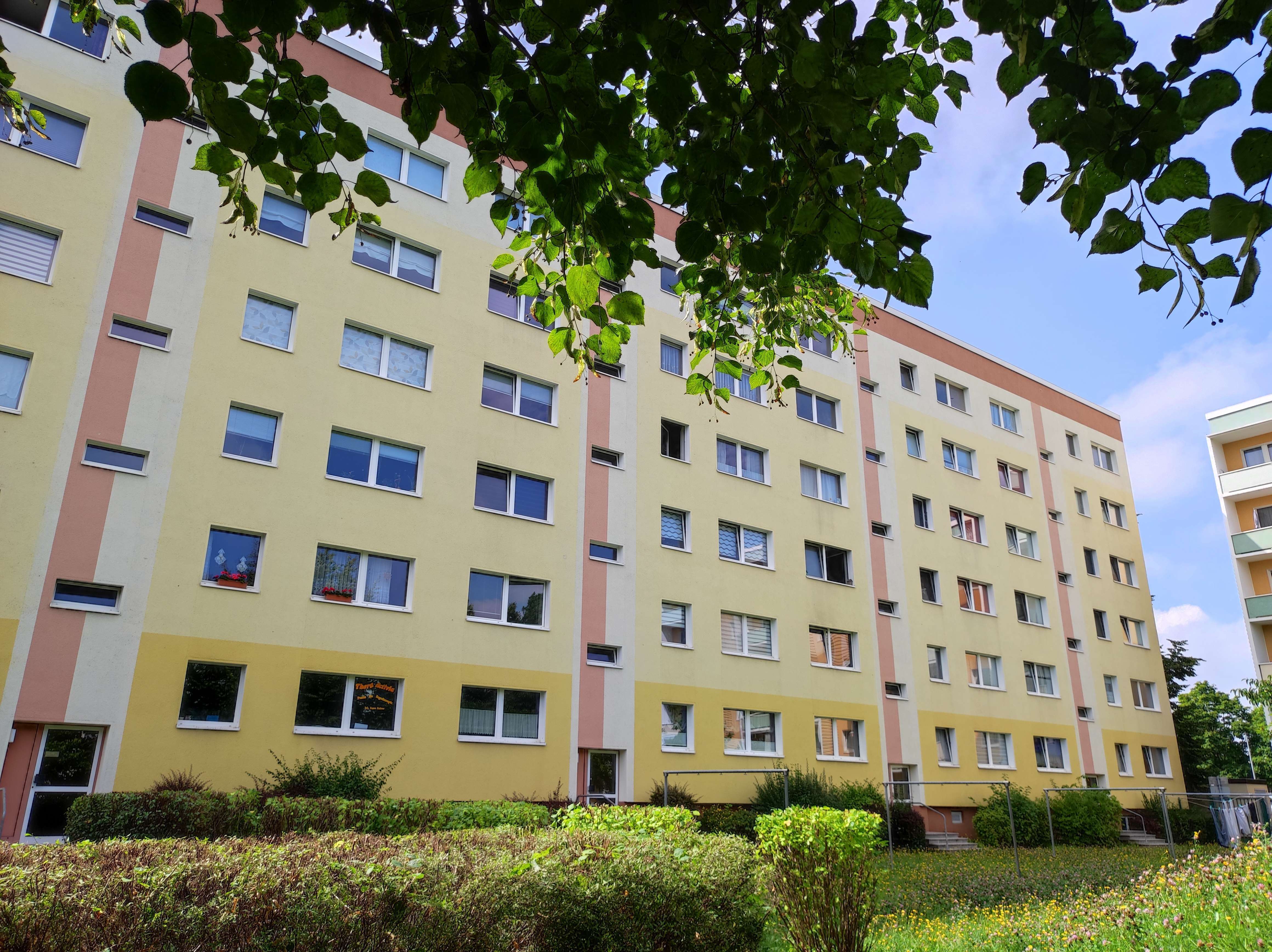 Zum Verkauf steht eine schöne ca. 68m² große Eigentumswohnung mit herrlichem Blick in einem Mehrfamilienhaus in Chemnitz. Sie befindet sich im 5. Stock und verfügt über eine sehr schöne Aussicht. Es gibt jedoch keinen Aufzug. Vom Flur aus sind alle Räume zugänglich. Das große Wohnzimmer mit offener Küche bietet viel Platz zum Kochen, Essen, Relaxen und gemütlichem Beisammen sein. Vom Wohnzimmer besteht Zugang zum großen Balkon, auf welchem sie bei einem Glas Wein den Tag ausklingen lassen und dabei die Aussicht genießen können. Weiter gehört zur WE ein großes Elternschlafzimmer und ein Kinderzimmer. Auch hier haben sie einen schönen Ausblick ins Grüne. Das kleine Bad mit Wanne, WT und WC bietet auch Platz für die Waschmaschine und natürlich gibt es einen Flur. Zur Wohnung gehört ein PKW-Stellplatz etwas hinter dem Haus und im Keller ein Kellerabteil. Hier befindet sich auch ein gemeinschaftlicher Trockenraum zum Wäsche trocknen. Auch hinter dem Haus befindet sich ein gemeinschaftlicher Wäscheplatz.