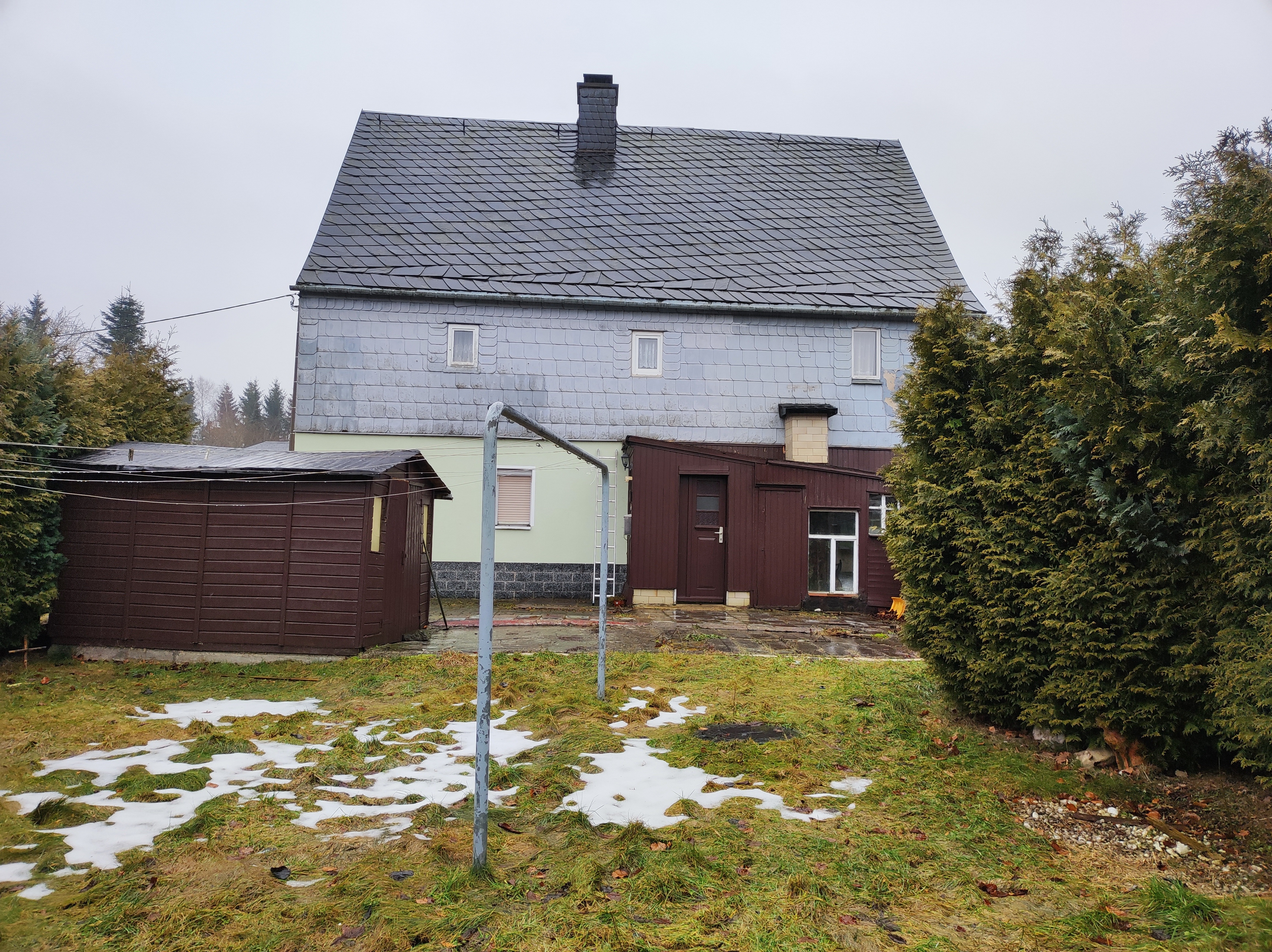Zum Verkauf steht ein großes Einfamilienhaus im ländlich geprägten Dorf Grumbach im Erzgebirge. Das Objekt steht unter Denkmalschutz und wurde im Fachwerkstil vor 1900 erbaut. Das genaue Baujahr ist leider nicht bekannt. Auf 3 Etagen stehen ihnen ca.140 m² Wohnfläche zur Verfügung. Über einen kleinen Windfang betritt man das Haus. Vom großen Flur gelangt man in die Räume. Es gibt hier auf der linken Seite ein großes Wohnzimmer mit angeschlossener Küche. Auf der rechten Seite befindet sich ein großer kühler Abstellraum und ein kleiner Vorraum mit Zugang zum kleinen Gewölbekeller, in welchem Brunnenwasser genutzt werden kann. Über eine Holztreppe gelangt man ins Obergeschoss. Auf dieser Etage befindet sich eine Küche mit Zugang zum großen Wohnzimmer und zu einem Schlafzimmer. Ein weiteres Schlafzimmer ist vom Flur aus zugänglich, ebenso wie das Bad mit Wanne, Waschtisch und Toilette. Über eine weitere Holztreppe erreicht man das Dachgeschoss, welches zur Hälfte ausgebaut ist. Hier stehen 2 Schlafzimmer zur Verfügung. Der restliche Dachboden sowie der Dachspitz wurden zum Holz lagern und zur Aufbewahrung genutzt. Ein großer Garten mit Terrasse, einem Gartenhaus und mehreren Schuppen bietet Platz für viele Selbstverwirklichungen. Eine große Rasenfläche bietet den Kindern genug Platz zum Spielen und Toben. Auch für Sandkasten, Schaukel oder Pool findet sich eine Ecke. Einige Büsche bieten Schattenplätze und sonst gibt es genügend Freiraum für die Gestaltung nach eigenem Geschmack und Ambitionen. So kann man sicher mit dekorativen Pflanzen und Nutzpflanzen ein kleines Naturidyll schaffen und sich selbst versorgen. Auf der Terrasse kann man gemütliche Grillabende mit der Familie und Freunden verbringen. Eine große Garage bietet Platz für einen PKW.