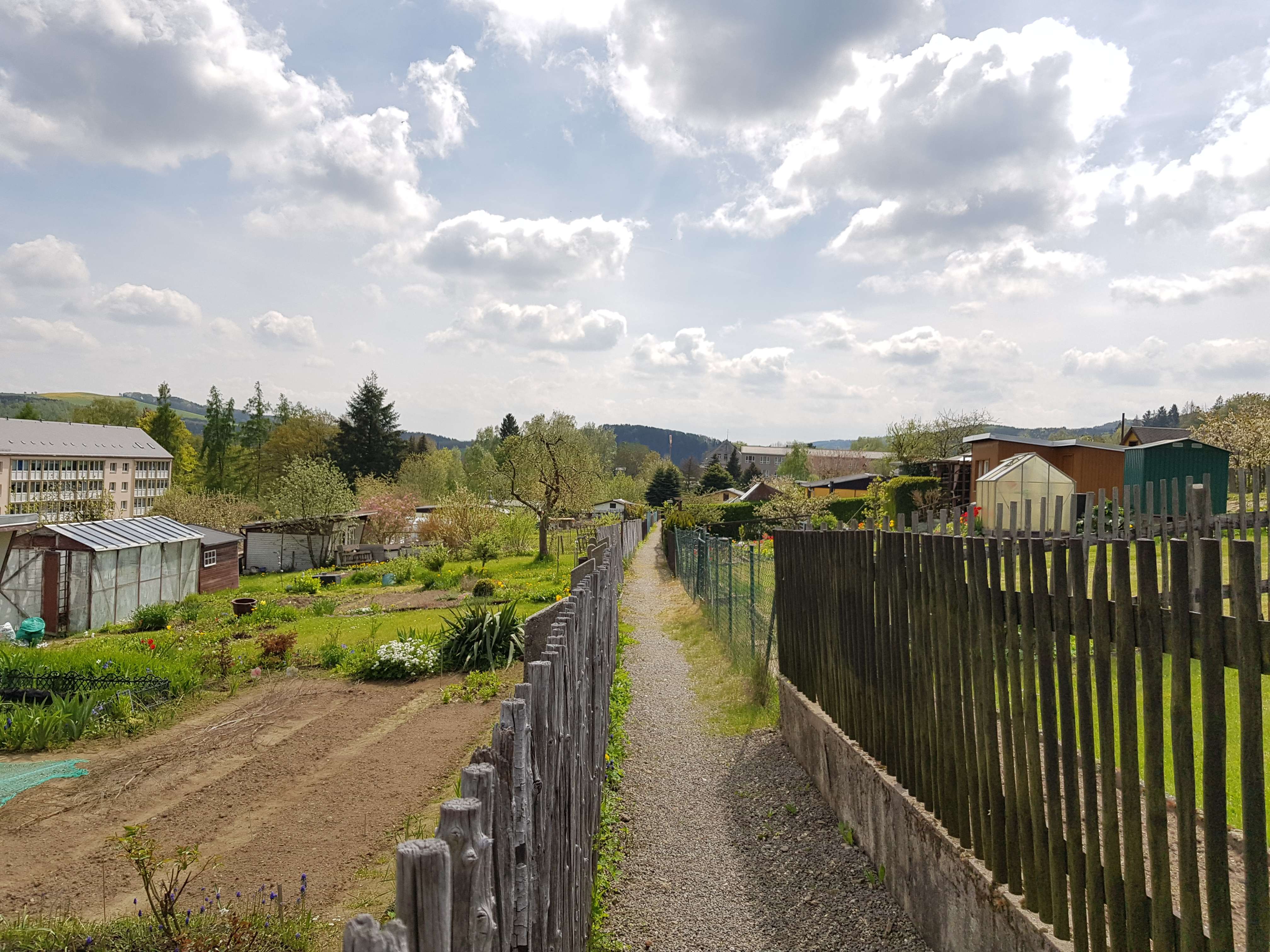 Das Grundstück liegt am Rande von Pockau und ist sehr sonnig, leicht abschüssig und verfügt über einen fantastischen Ausblick über das Tal. Die Gärten sind teilweise sehr gepflegt.