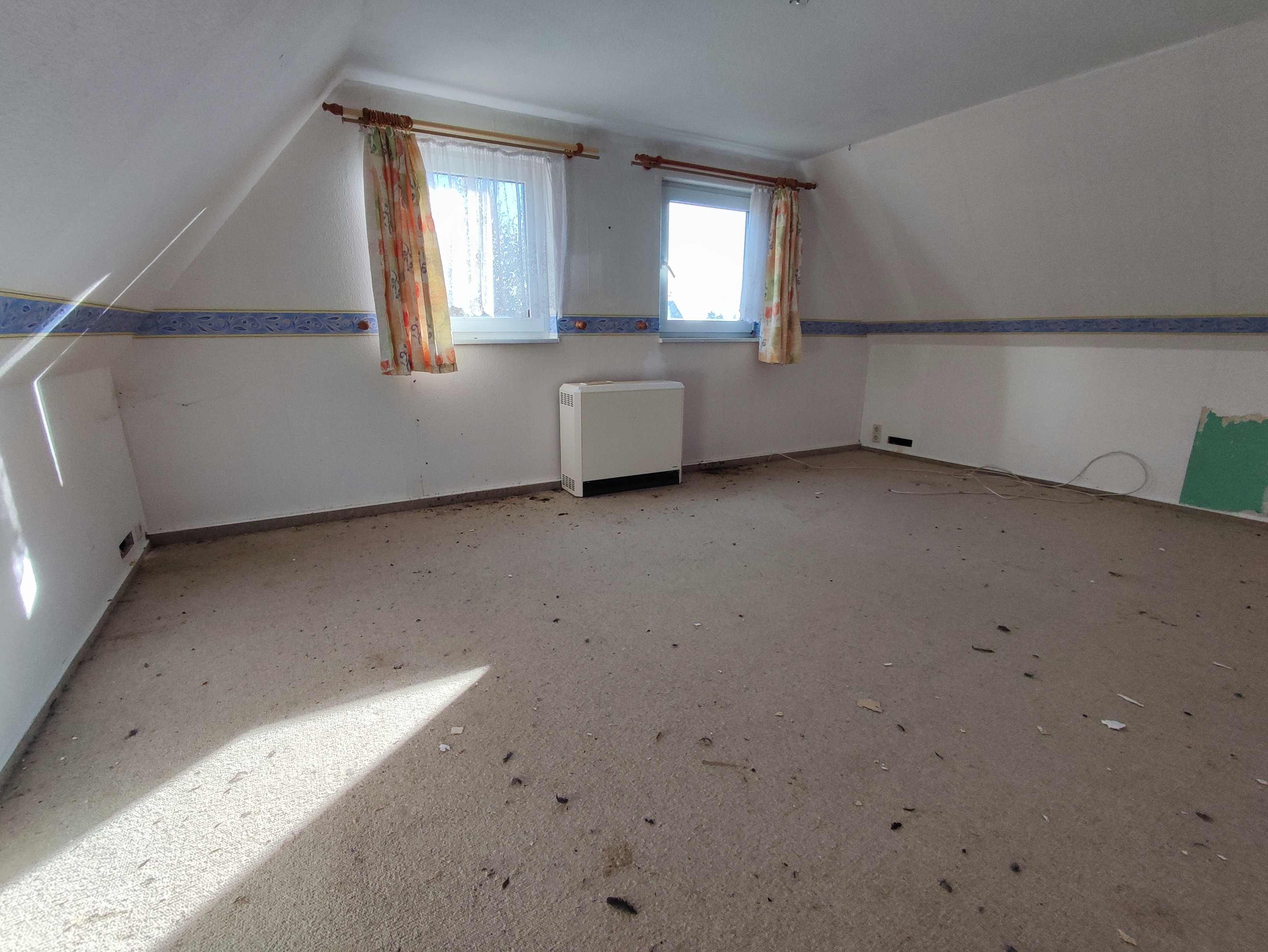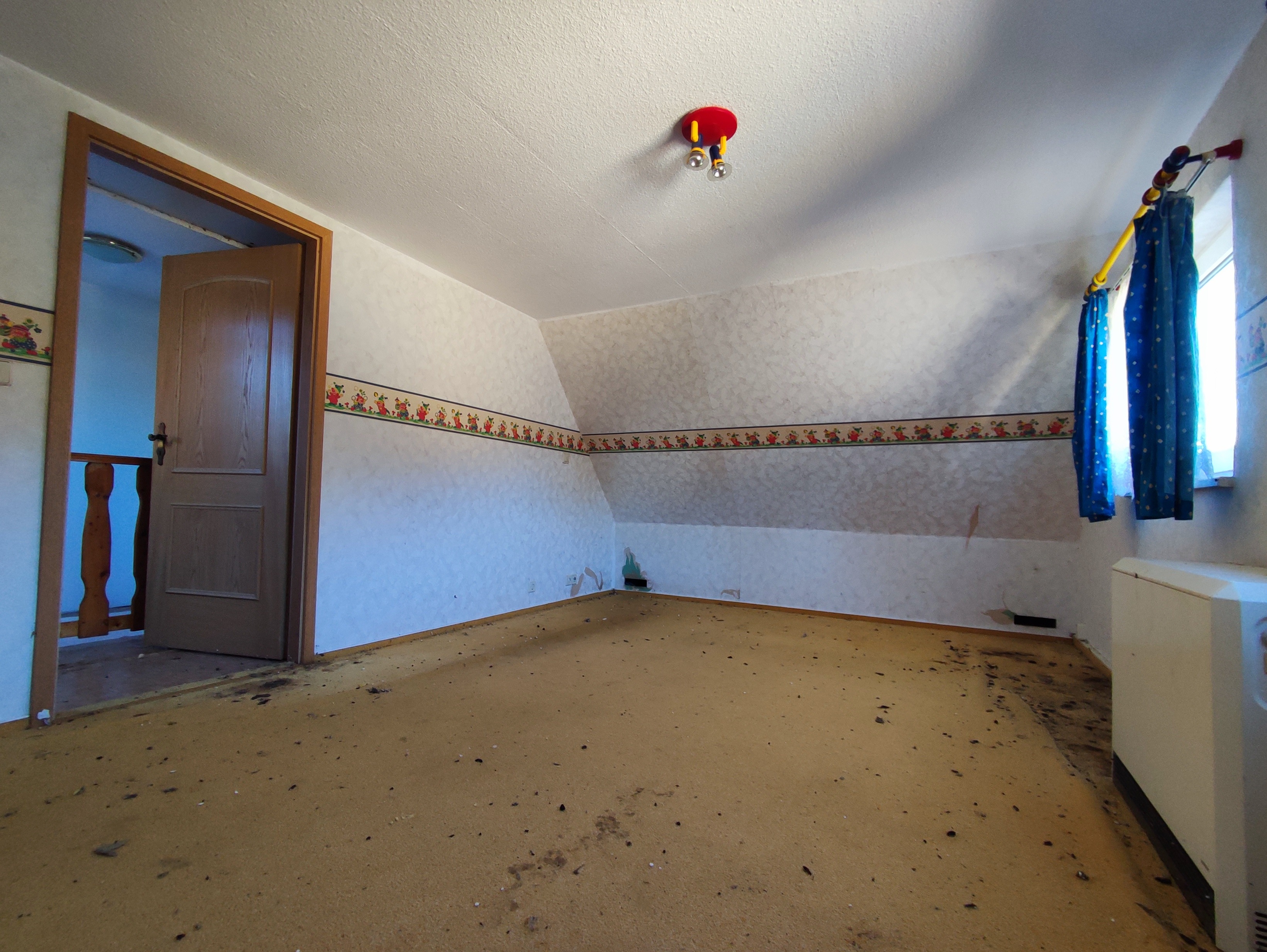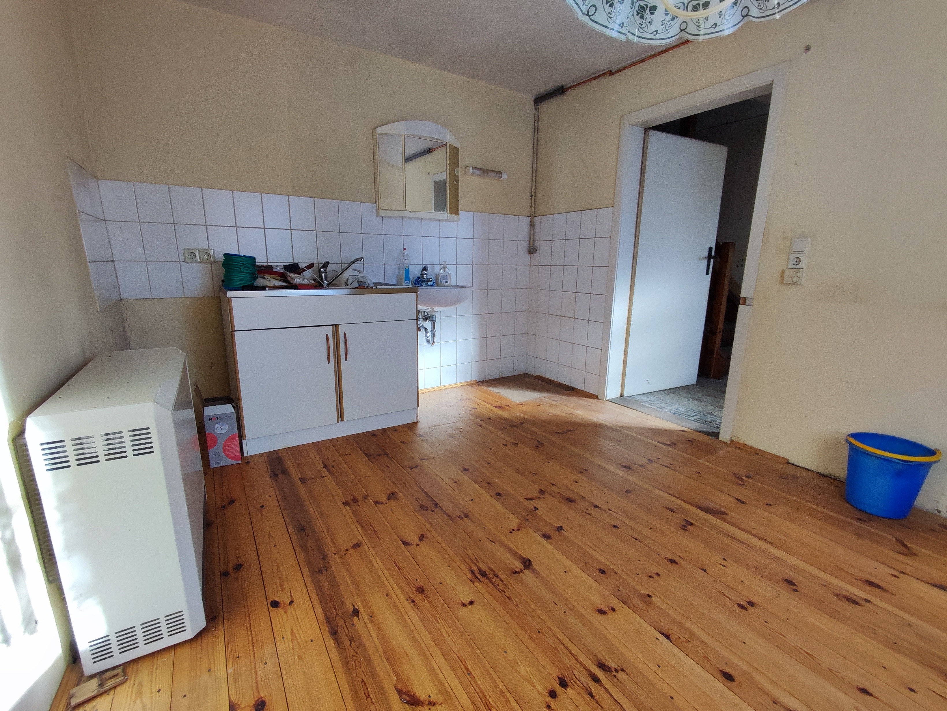 Das Grundstück ist weiter mit einem um ca. 1850 im Fachwerkstil erbautes Einfamilienhaus bebaut. Auf 2 Etagen und dem ausgebauten Dachgeschoss stehen ihnen ca. 100 m² Wohnfläche zur Verfügung. Man kann das Haus direkt über die Vorderfront oder über den Hintereingang betreten. Betritt man das Haus vom Vordereingang, so befindet man sich zunächst im Hausflur/Treppenhaus. Auf der rechten Seite befindet sich ein großes Wohnzimmer mit Kachelofen und direkt anschließend ein kleines individuell nutzbares Zimmer. Auf der linken Seite befindet sich eine Küche mit erneuertem Dielenboden, das Bad mit Dusche, Waschtisch, WC und Waschmaschinenanschluss sowie ein kleiner Abstellraum und der Kellerzugang. Über eine Holztreppe gelangt man ins 1. Obergeschoss. Hier befindet sich ein weiterer kleiner Raum mit Wasseranschluss und daran anschließend ein großes Schlafzimmer. Auch hier grenzt wieder ein kleiner Raum an, welcher verschiedene Nutzungsmöglichkeiten bietet. Auf der gegenüberliegenden Seite befindet sich noch ein großes Schlafzimmer und ein weiteres kleines Zimmer. Über eine weitere Holztreppe erreicht man das ausgebaute Dachgeschoss, in welchem sich ein großer und kleiner Raum befinden. Diese können sie je nach Bedarf nutzen. Das Haus ist mit einem kleinen Gewölbekeller teilweise unterkellert. Auf der Rückseite des Hauses befindet sich ein kleiner Anbau mit 3 kleinen Abteilen, welche zum Abstellen für Gartenmöbel und Gartengeräte dienen kann.