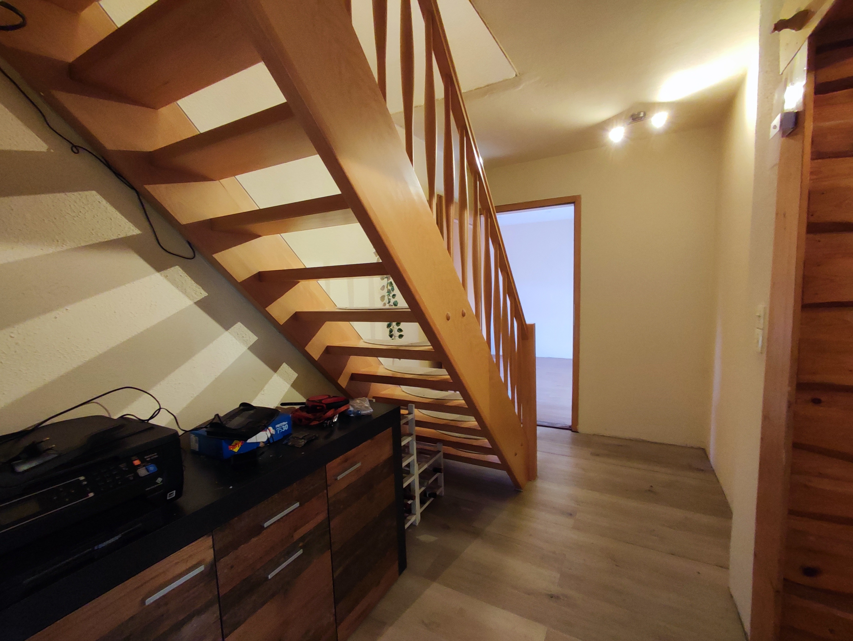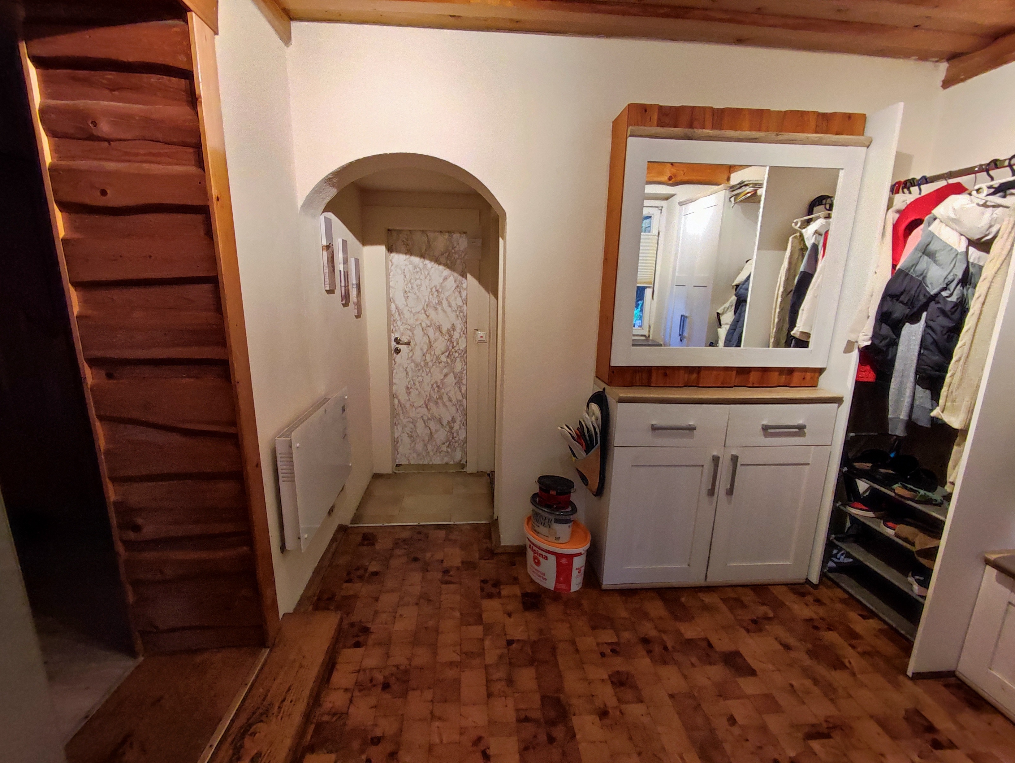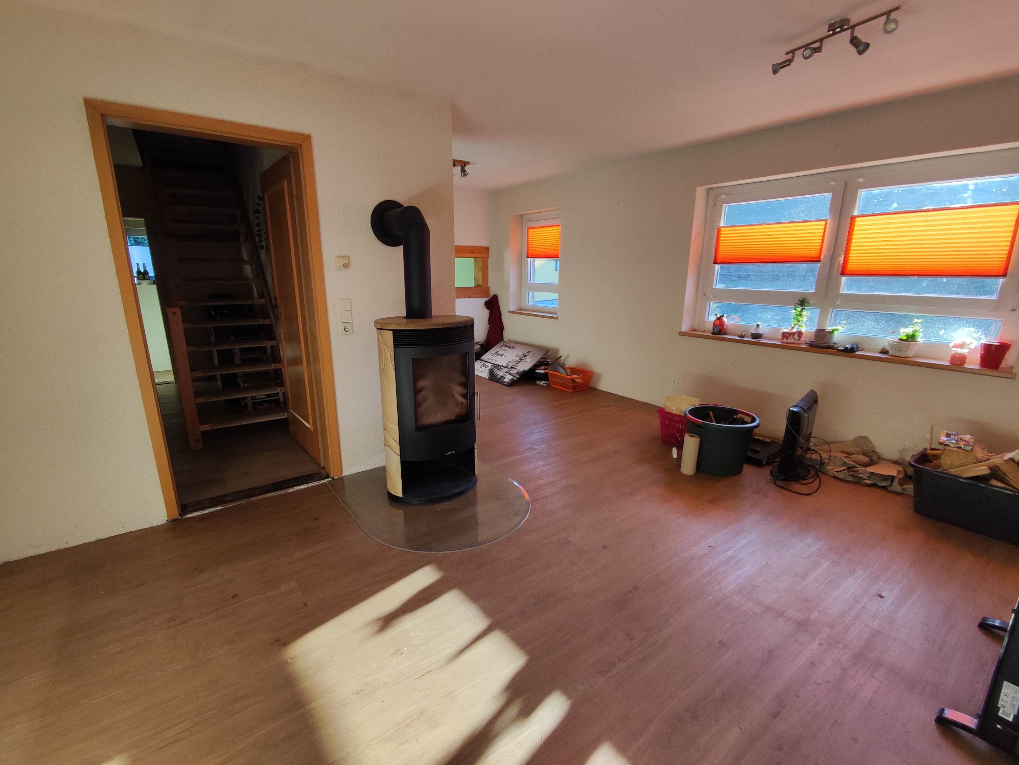 Man betritt das Haus und befindet sich zuerst im Flur. Hier wurden alte Holzmaterialien der Scheune für den Bodenbelag wieder verwendet und einige Holzbalken als Deko-Elemente eingefügt. Von hier gelangt man auch direkt ins Badezimmer mit Wanne, Dusche, Waschtisch und WC. Eine indirekte Beleuchtung und der absichtlich grob gehaltene Putz spiegeln die alte Nutzung wieder und sorgen für Behaglichkeit. Nebendran befindet sich der Zugang zum Keller. Vom Flur aus weiter gelangt man in einen Zwischenflur von welchem es weiter in 2 Küchenräume geht. Im Raum 1 ist quasi der Arbeitsbereich und Ablagefläche und im Raum 2 befindet sich der gemütliche Essbereich und die Anschlüsse für Wasser/Abwasser und Strom. Hier sorgt eine kürzlich eingebrachte Plameco-Decke mit integrierter Beleuchtung für modernes Flair und entspannter Beleuchtung. Durch 2 kleine Fenster/Durchreichen ist das Esszimmer mit dem Wohnzimmer verbunden. So wäre es auch möglich, die Essecke im Wohnzimmer einzurichten und die beiden Küchen als Küche und Vorrats-/Abstellraum zu nutzen. Das große und helle Wohnzimmer bietet viel Platz und einen zusätzlichen Kaminofen, welcher in der kalten Jahreszeit für behagliche Wärme sorgt. Über eine Holztreppe gelangt man ins Obergeschoss. Hier befinden sich 4 Schlafräume. Ein großes Schlafzimmer mit einem Podest über ca. 1/3 der Fläche, ein kleines Schlafzimmer und 2 zusammenhängende Schlafzimmer. Durch den nachträglichen Anbau befindet sich hier ein schönes rundes Fenster zum Treppenhaus, was diesem eine besondere Optik verleiht. Von hier besteht der Zugang zum Dachspitz, welcher als Ablageort genutzt wird. Weiterhin befindet sich hier auch der Zugang zum großen, überdachten Balkon. Dieser bietet Platz zum Wäschetrocknen bei schlechtem Wetter oder genießen sie hier gemütliche Abende mit der Familie. Im Keller gibt es viel Platz zum Abstellen oder für eine Werkbank. Hier befindet sich der Warmwasserspeicher, der Stromkasten und ein Haus-Ausgang. Von außen zugänglich gibt es noch einen kleinen Gewölbekeller. Angrenzend am Eingangsbereich des Hauses befindet sich eine schöne mit Natursteinen errichtete Terrasse mit Pergola und Sichtschutz. Genießen sie hier gemütliche Grillabende mit der Familie und Freunden. Das weitergehende Grundstück besteht aus Rasenfläche mit Wäscheplatz und hinter dem Haus befindet sich ein mit Büschen und Bäumen bewachsener Hang. Da es zum Grundstück keinen Parkplatz oder eine Garage gibt, wurde bereits eine Baugenehmigung für eine straßenseitige Anbindung gestellt und genehmigt. Parken kann man sonst im öffentlichen Raum. Auch die Zuwegung zum Haus besteht aktuell über das Nachbargrundstück, wobei es dafür ein eingetragenes Wegerecht gibt. Durch die Errichtung des Carports und einer eigenen Zuwegung wäre man vom Wegerecht unabhängig. Das Objekt ist an eine vollbiologische Kleinkläranlage angeschlossen. Diese wird gemeinschaftlich mit dem Nachbar genutzt und die Kosten werden geteilt. Auch gibt es eine gemeinschaftliche Nutzung eines Brunnens mit dem Nachbar.