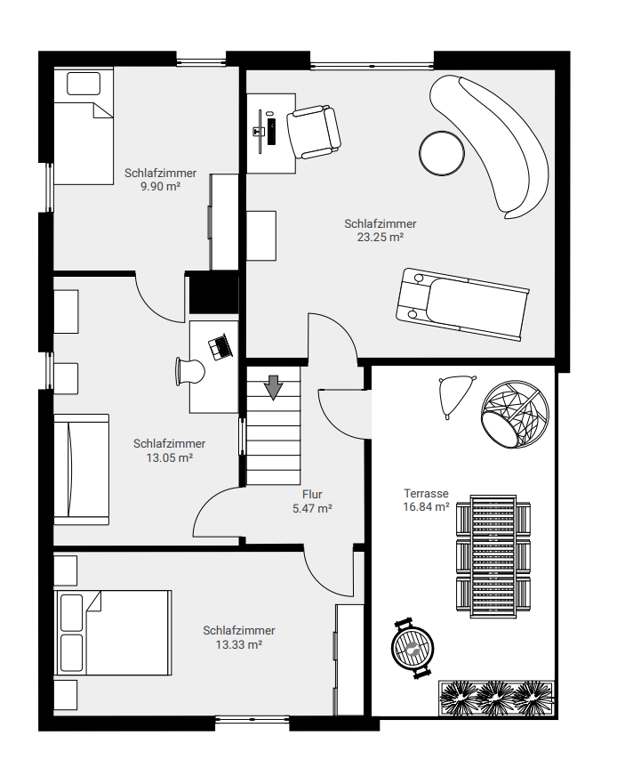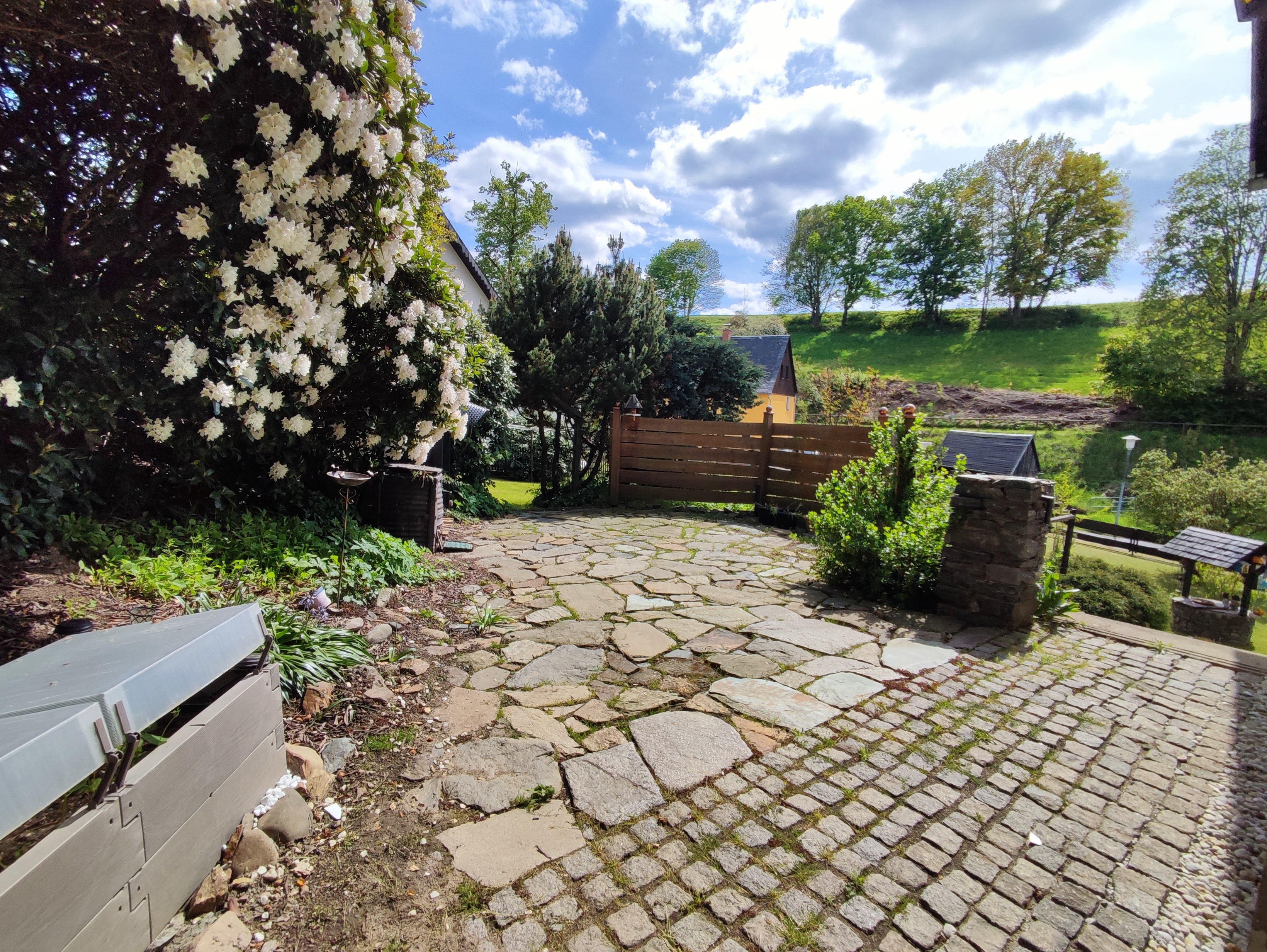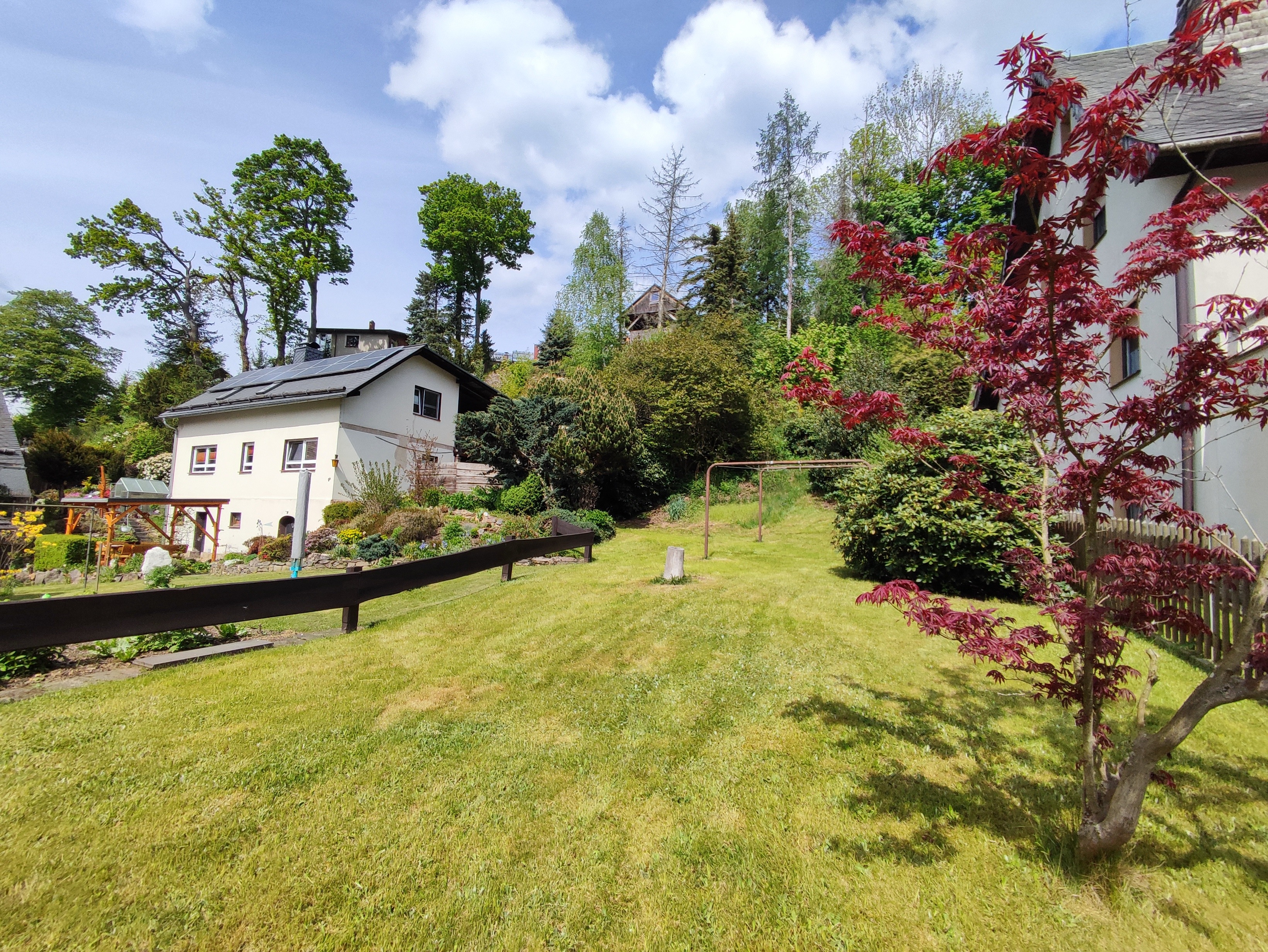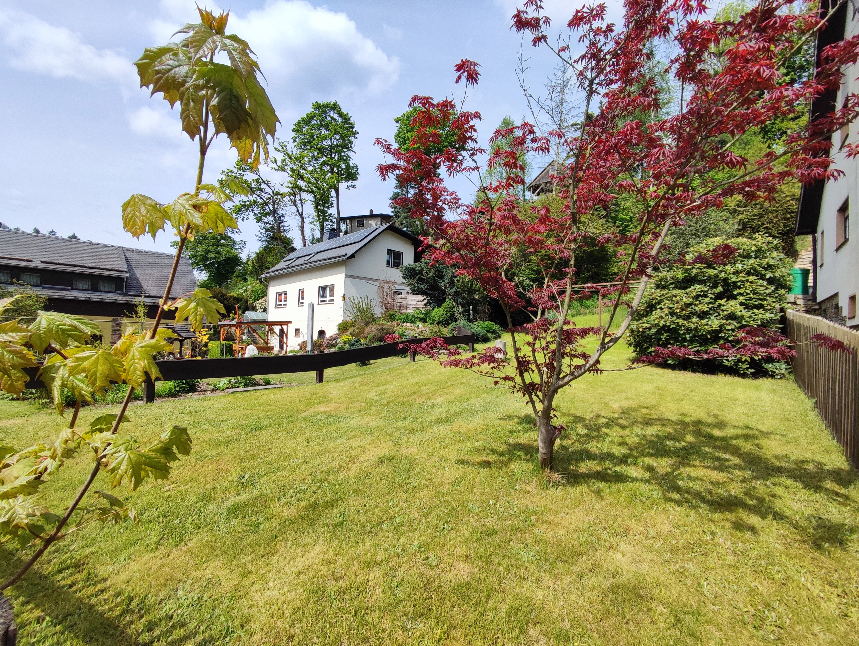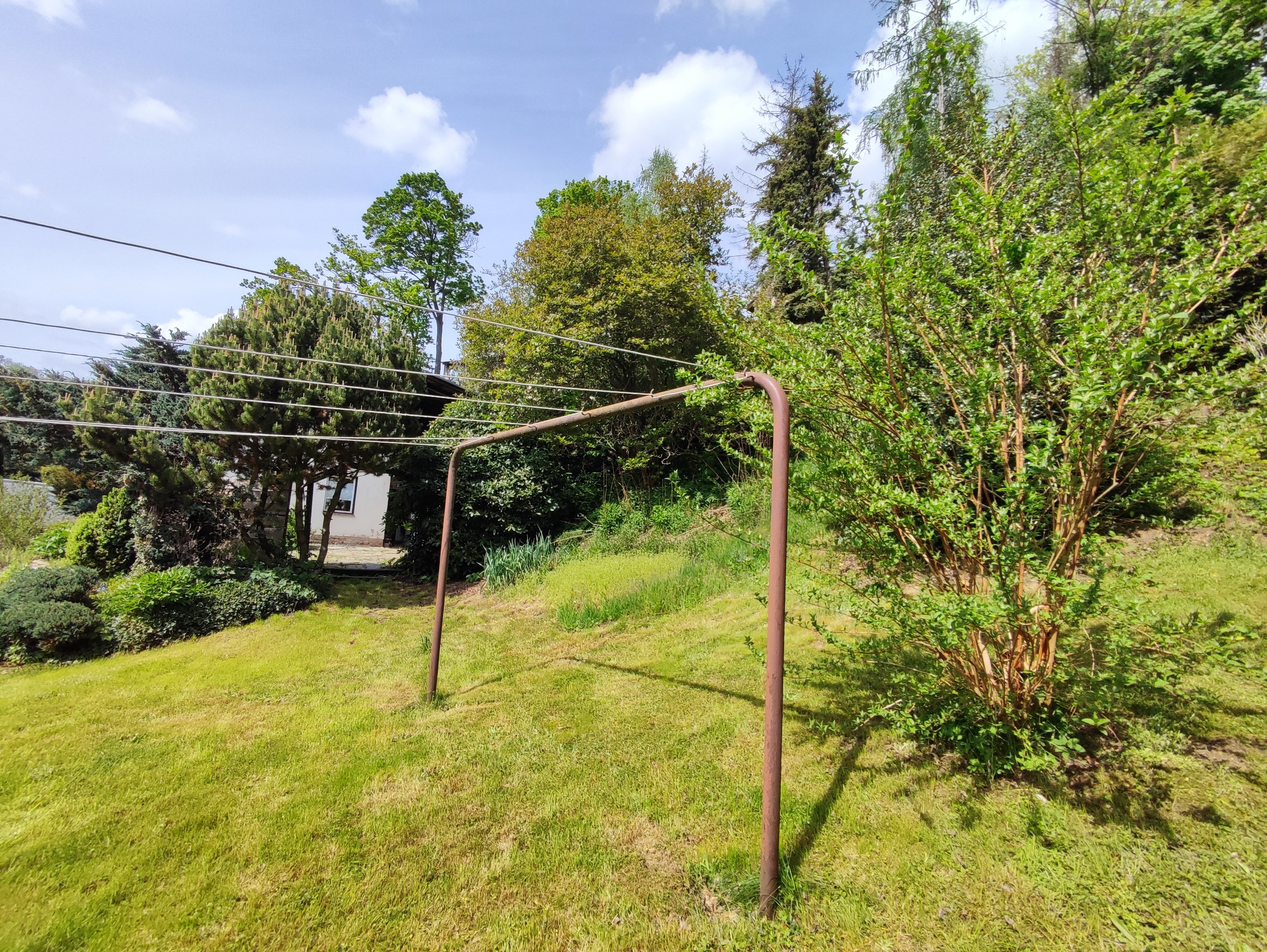 Vom 1050m² großen Grundstück sind nur ca. 315m² Fläche nutzbar (Wiese und Terrasse). Ca. 540m² sind Steilhang hinter dem Haus, dieser ist mit Bäumen und Sträuchern bewachsen und nicht nutzbar.