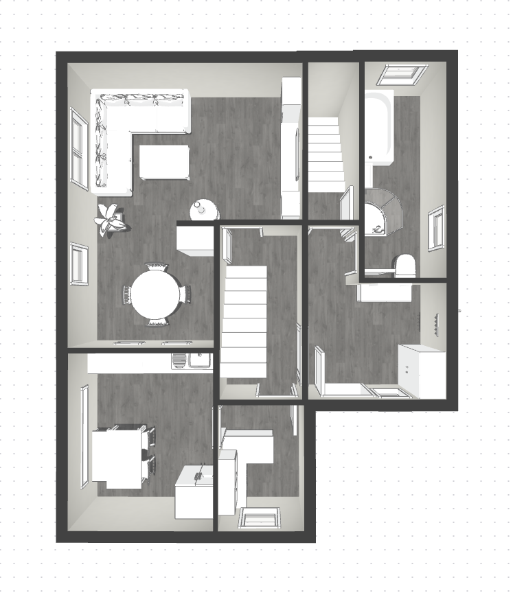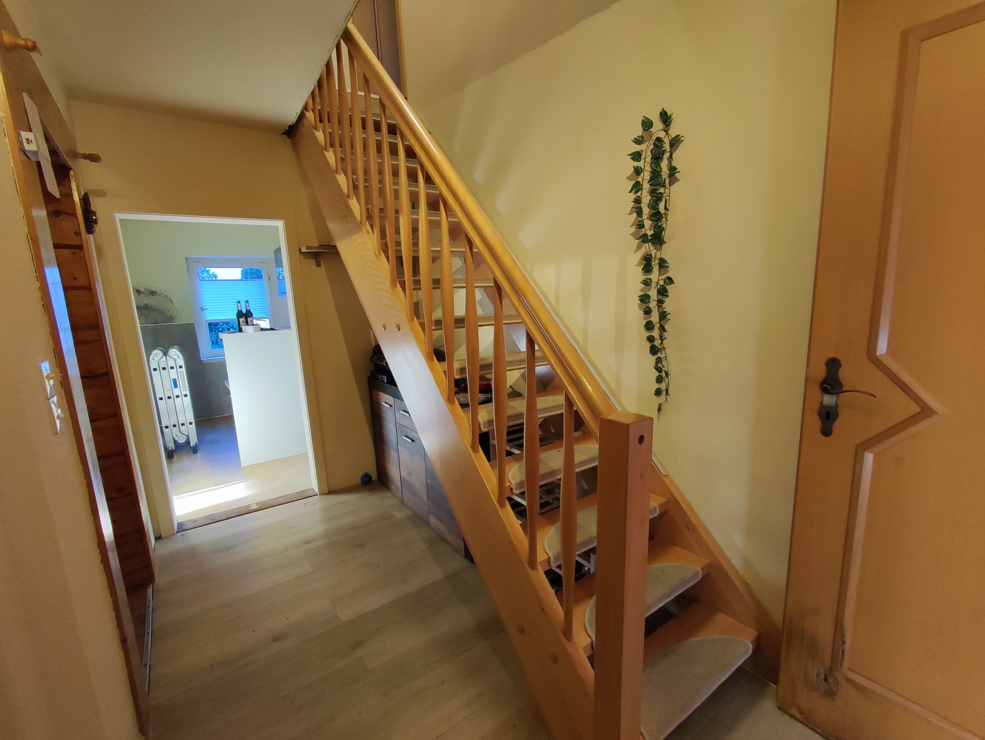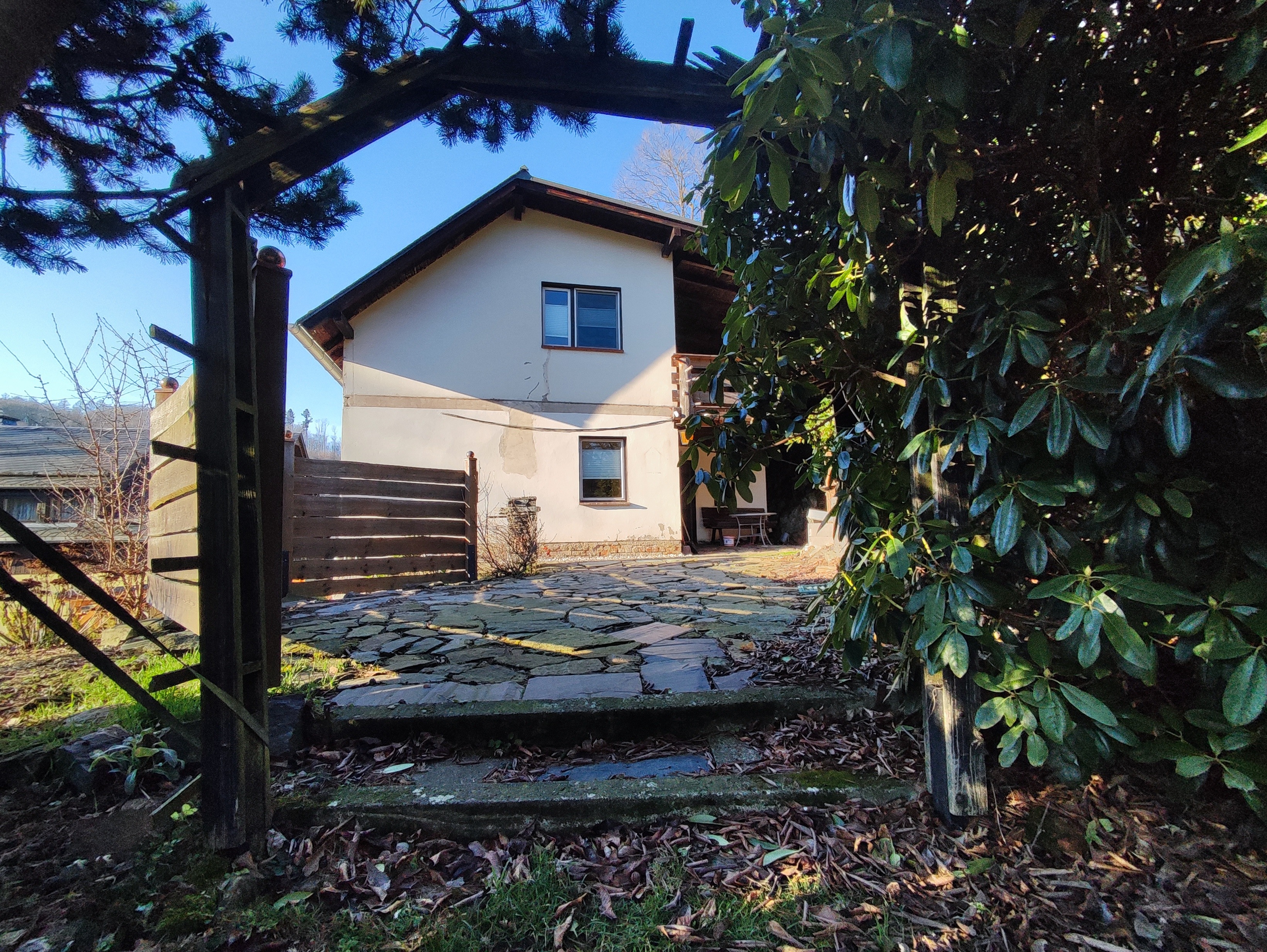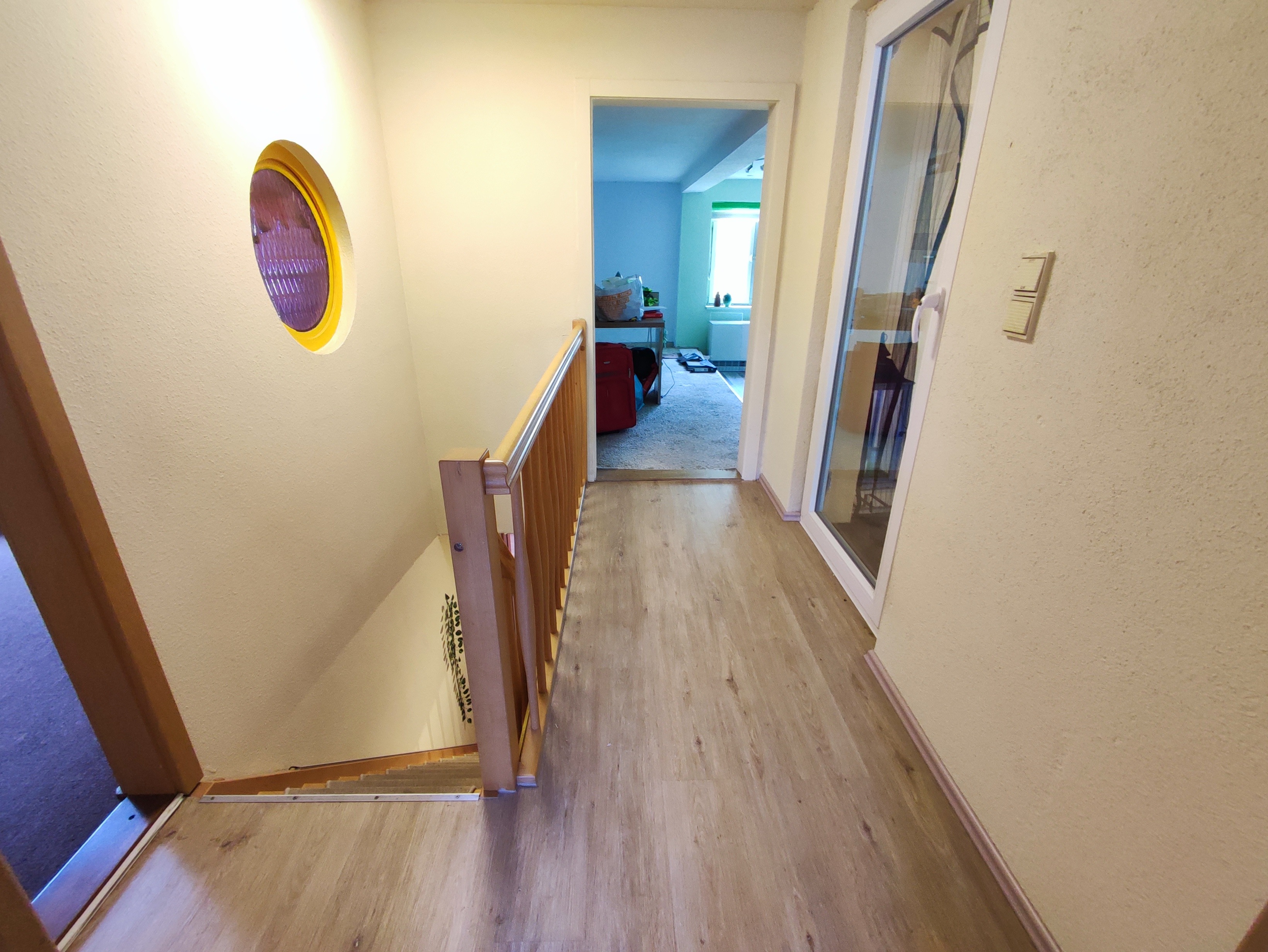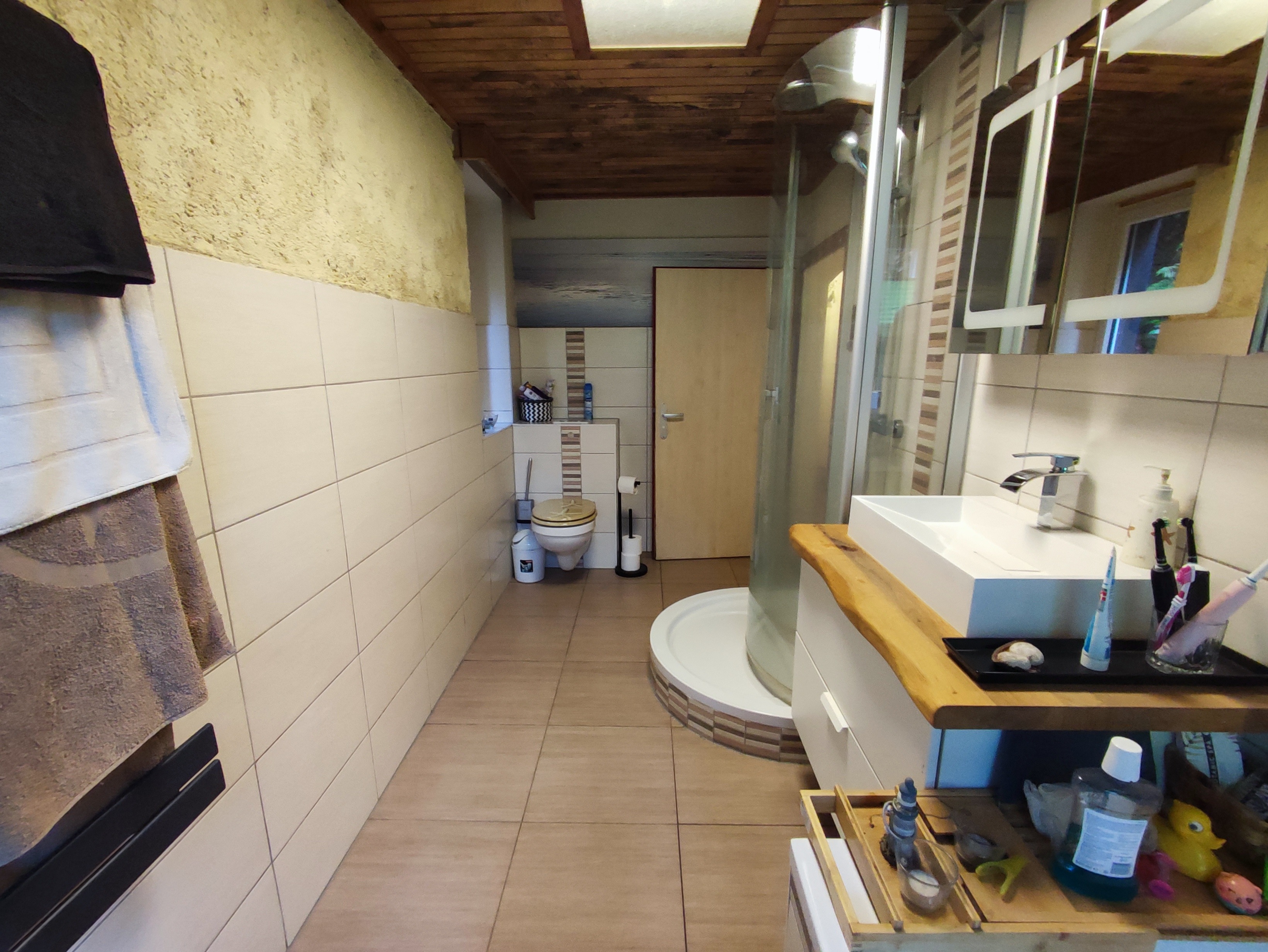 Man betritt das Haus und befindet sich zuerst im Flur. Hier wurden alte Holzmaterialien der Scheune für den Bodenbelag wieder verwendet und einige Holzbalken als Deko-Elemente eingefügt. Von hier gelangt man auch direkt ins Badezimmer mit Wanne, Dusche, Waschtisch und WC. Eine indirekte Beleuchtung und der absichtlich grob gehaltene Putz spiegeln die alte Nutzung wieder und sorgen für Behaglichkeit. Nebendran befindet sich der Zugang zum Keller. Vom Flur aus weiter gelangt man in einen Zwischenflur von welchem es weiter in 2 Küchenräume geht. Im Raum 1 ist quasi der Arbeitsbereich und Ablagefläche und im Raum 2 befindet sich der gemütliche Essbereich und die Anschlüsse für Wasser/Abwasser und Strom. Hier sorgt eine kürzlich eingebrachte Plameco-Decke mit integrierter Beleuchtung für modernes Flair und entspannter Beleuchtung. Durch 2 kleine Fenster/Durchreichen ist das Esszimmer mit dem Wohnzimmer verbunden. So wäre es auch möglich, die Essecke im Wohnzimmer einzurichten und die beiden Küchen als Küche und Vorrats-/Abstellraum zu nutzen. Das große und helle Wohnzimmer bietet viel Platz und einen zusätzlichen Kaminofen, welcher in der kalten Jahreszeit für behagliche Wärme sorgt. Über eine Holztreppe gelangt man ins Obergeschoss. Hier befinden sich 4 Schlafräume. Ein großes Schlafzimmer mit einem Podest über ca. 1/3 der Fläche, ein kleines Schlafzimmer und 2 zusammenhängende Schlafzimmer. Durch den nachträglichen Anbau befindet sich hier ein schönes rundes Fenster zum Treppenhaus, was diesem eine besondere Optik verleiht. Von hier besteht der Zugang zum Dachspitz, welcher als Ablageort genutzt wird. Weiterhin befindet sich hier auch der Zugang zum großen, überdachten Balkon. Dieser bietet Platz zum Wäschetrocknen bei schlechtem Wetter oder genießen sie hier gemütliche Abende mit der Familie. Im Keller gibt es viel Platz zum Abstellen oder für eine Werkbank. Hier befindet sich der Warmwasserspeicher, der Stromkasten und ein Haus-Ausgang. Von außen zugänglich gibt es noch einen kleinen Gewölbekeller. Angrenzend am Eingangsbereich des Hauses befindet sich eine schöne mit Natursteinen errichtete Terrasse mit Pergola und Sichtschutz. Genießen sie hier gemütliche Grillabende mit der Familie und Freunden. Das weitergehende Grundstück besteht aus Rasenfläche mit Wäscheplatz und hinter dem Haus befindet sich ein mit Büschen und Bäumen bewachsener Hang. Da es zum Grundstück keinen Parkplatz oder eine Garage gibt, wurde bereits eine Baugenehmigung für eine straßenseitige Anbindung gestellt und genehmigt. Parken kann man sonst im öffentlichen Raum. Auch die Zuwegung zum Haus besteht aktuell über das Nachbargrundstück, wobei es dafür ein eingetragenes Wegerecht gibt. Durch die Errichtung des Carports und einer eigenen Zuwegung wäre man vom Wegerecht unabhängig. Das Objekt ist an eine vollbiologische Kleinkläranlage angeschlossen. Diese wird gemeinschaftlich mit dem Nachbar genutzt und die Kosten werden geteilt. Auch gibt es eine gemeinschaftliche Nutzung eines Brunnens mit dem Nachbar.