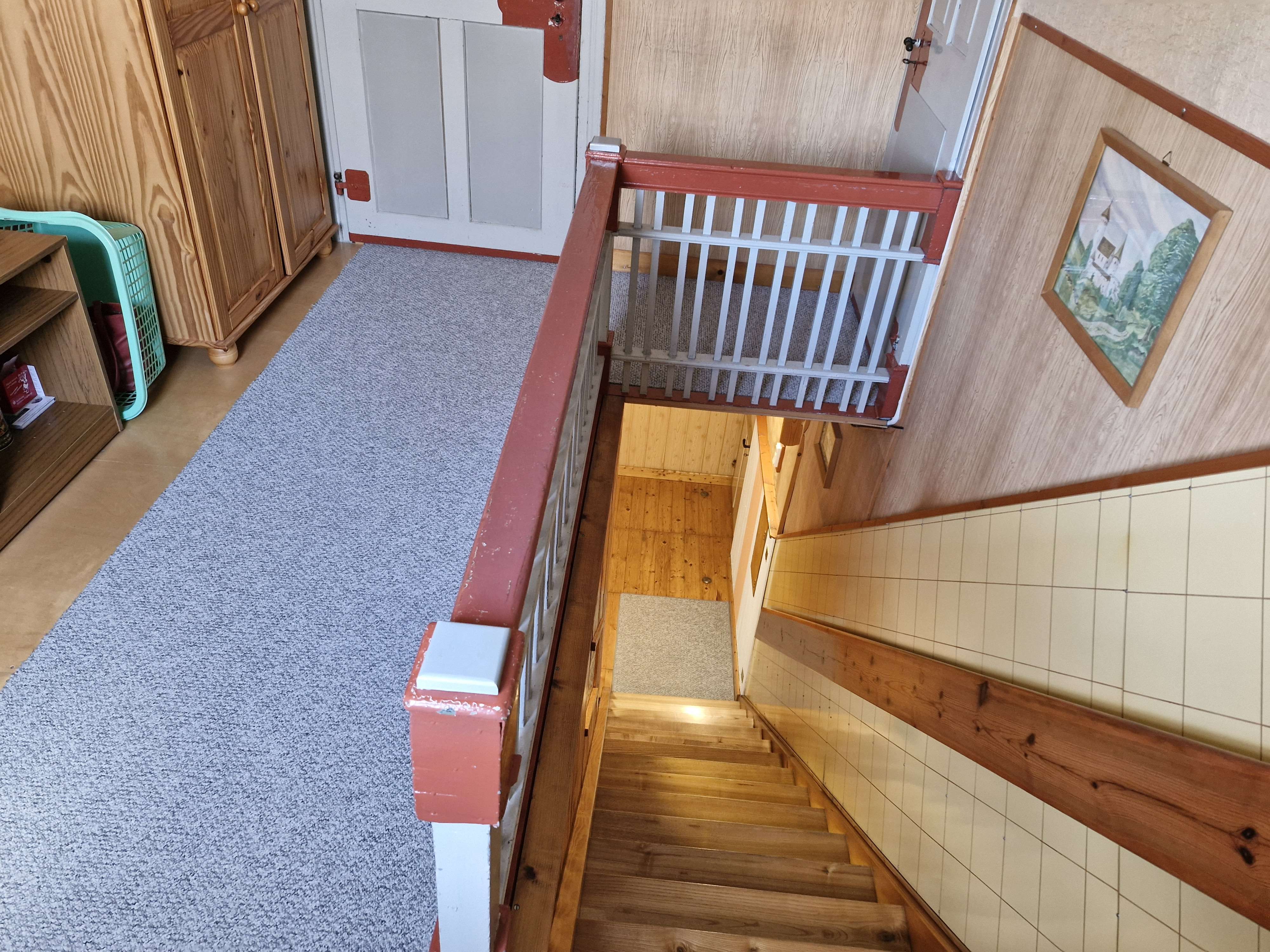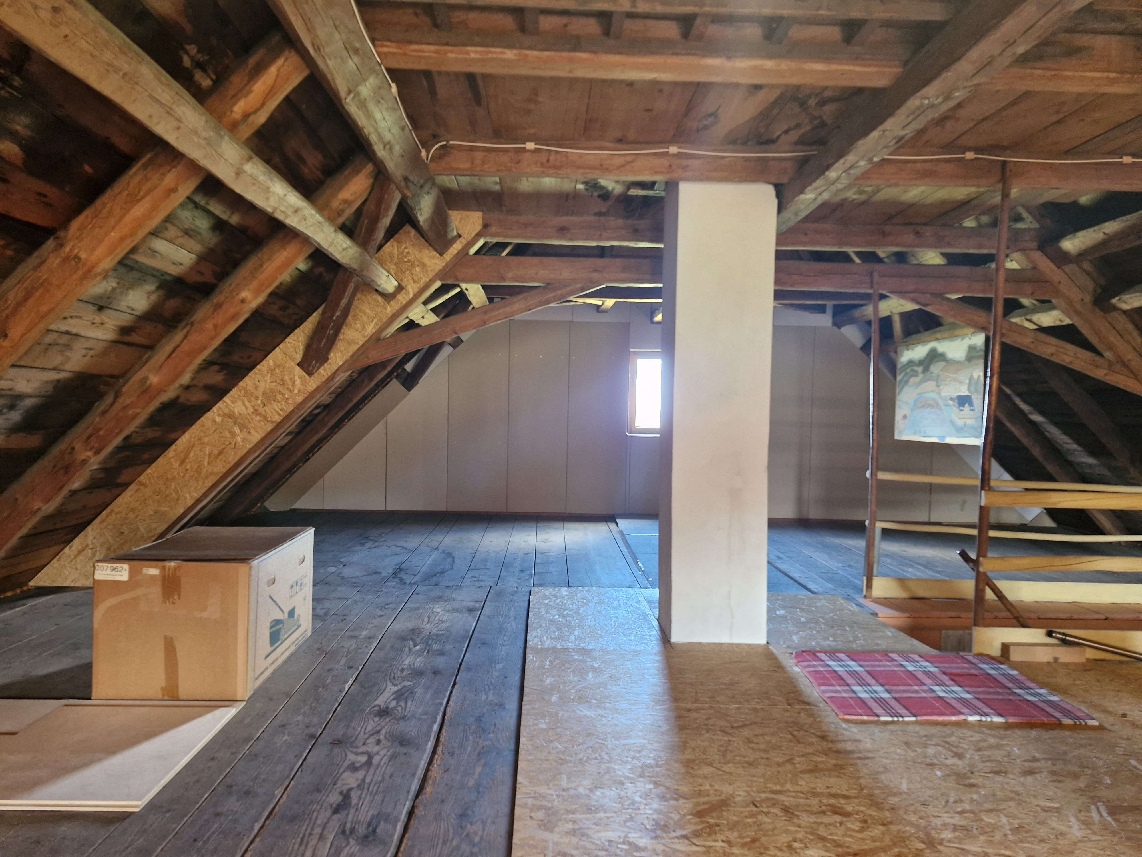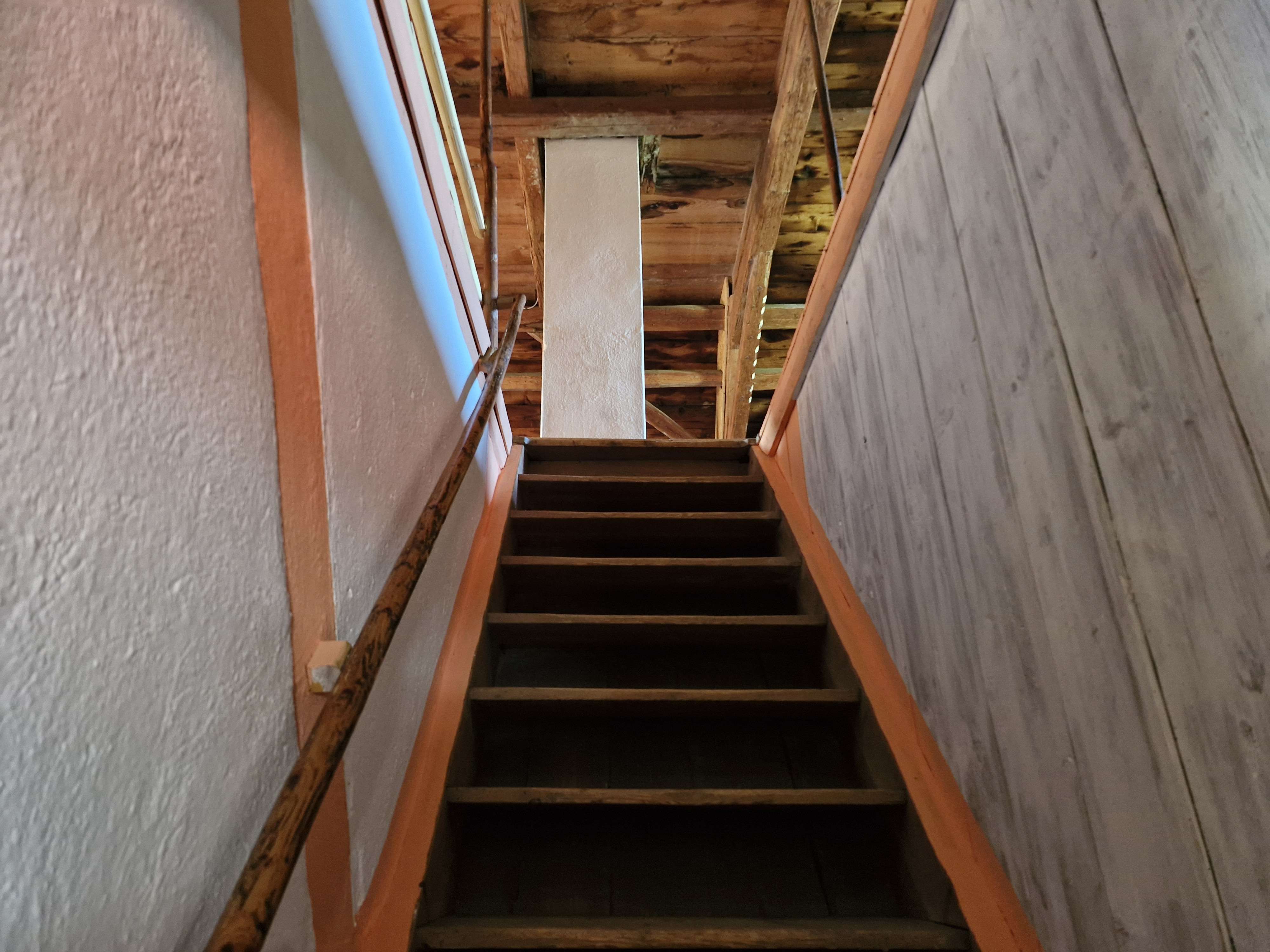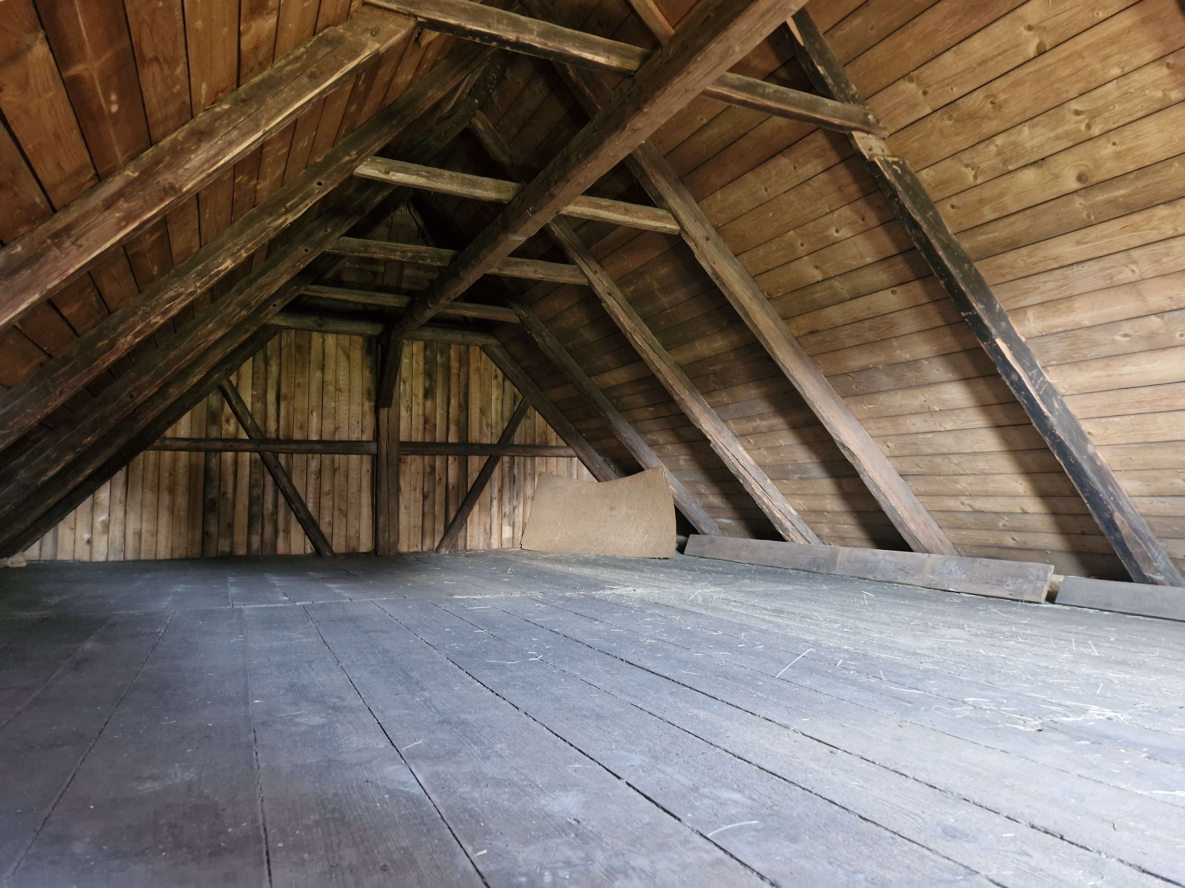 Über eine Holztreppe gelangen Sie in das Obergeschoss. Hier befindet sich auf der linken Seite ein zusätzliches WC sowie der Zugang zum Dachboden, der reichlich Stauraum bietet.