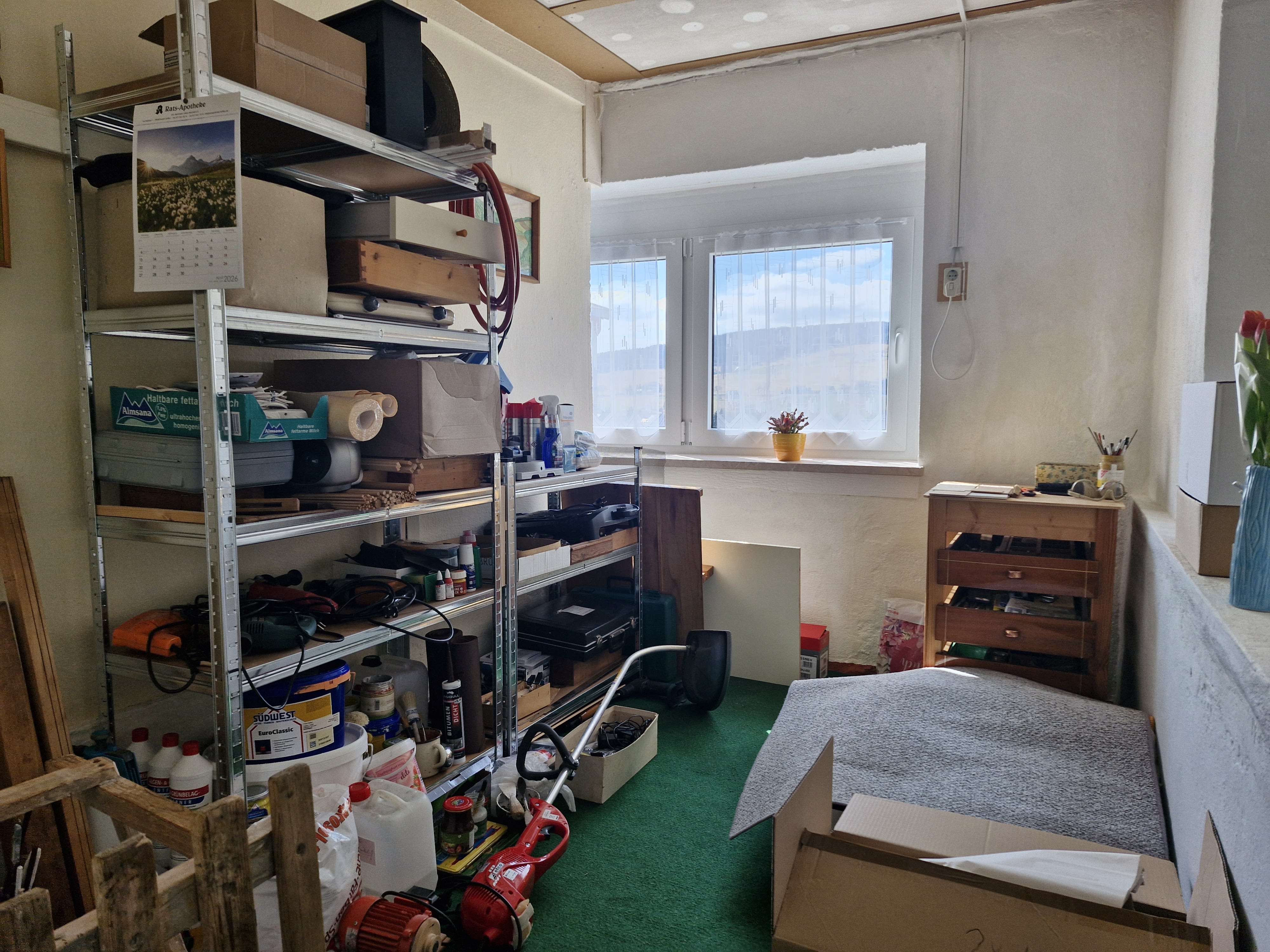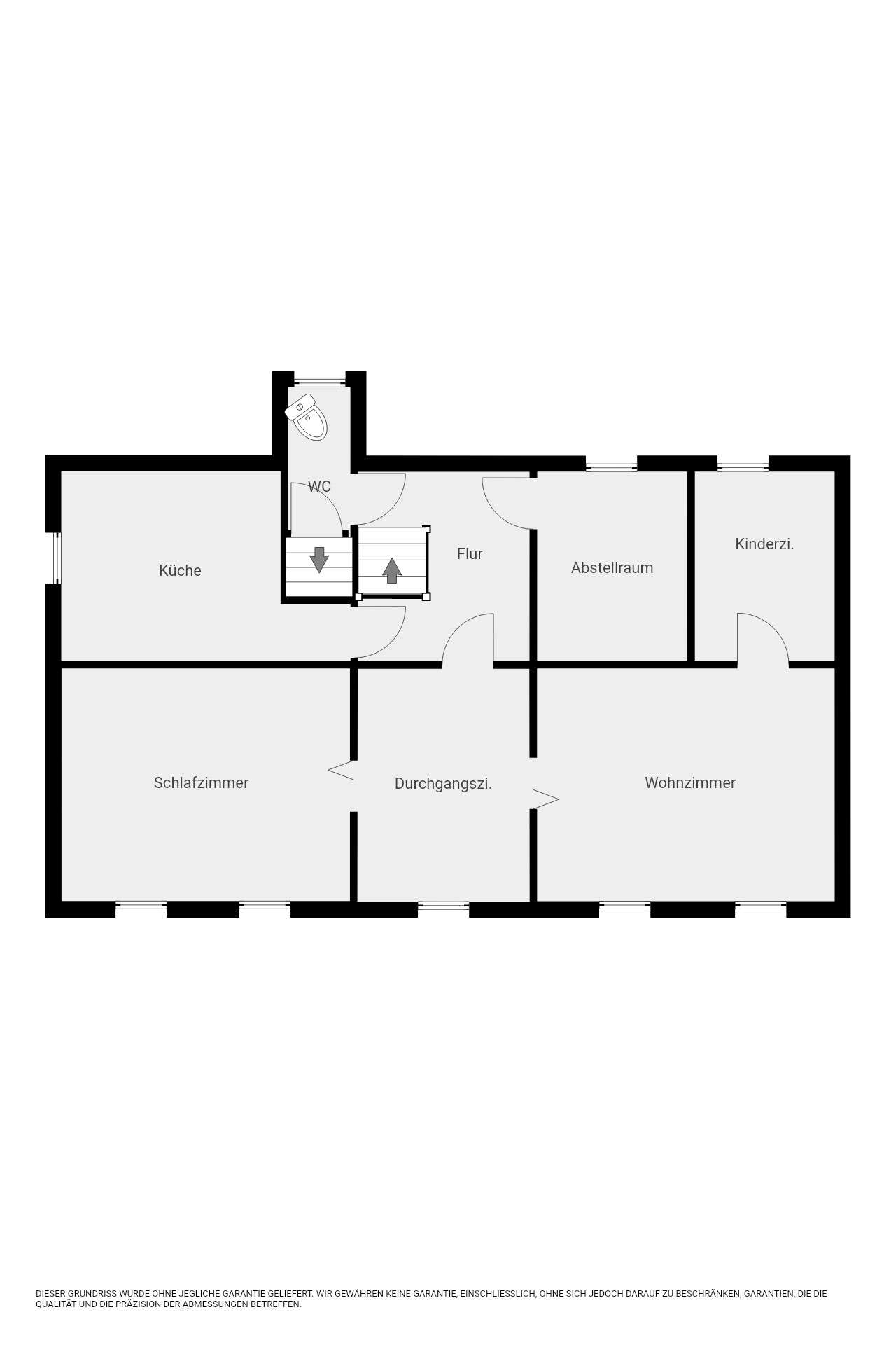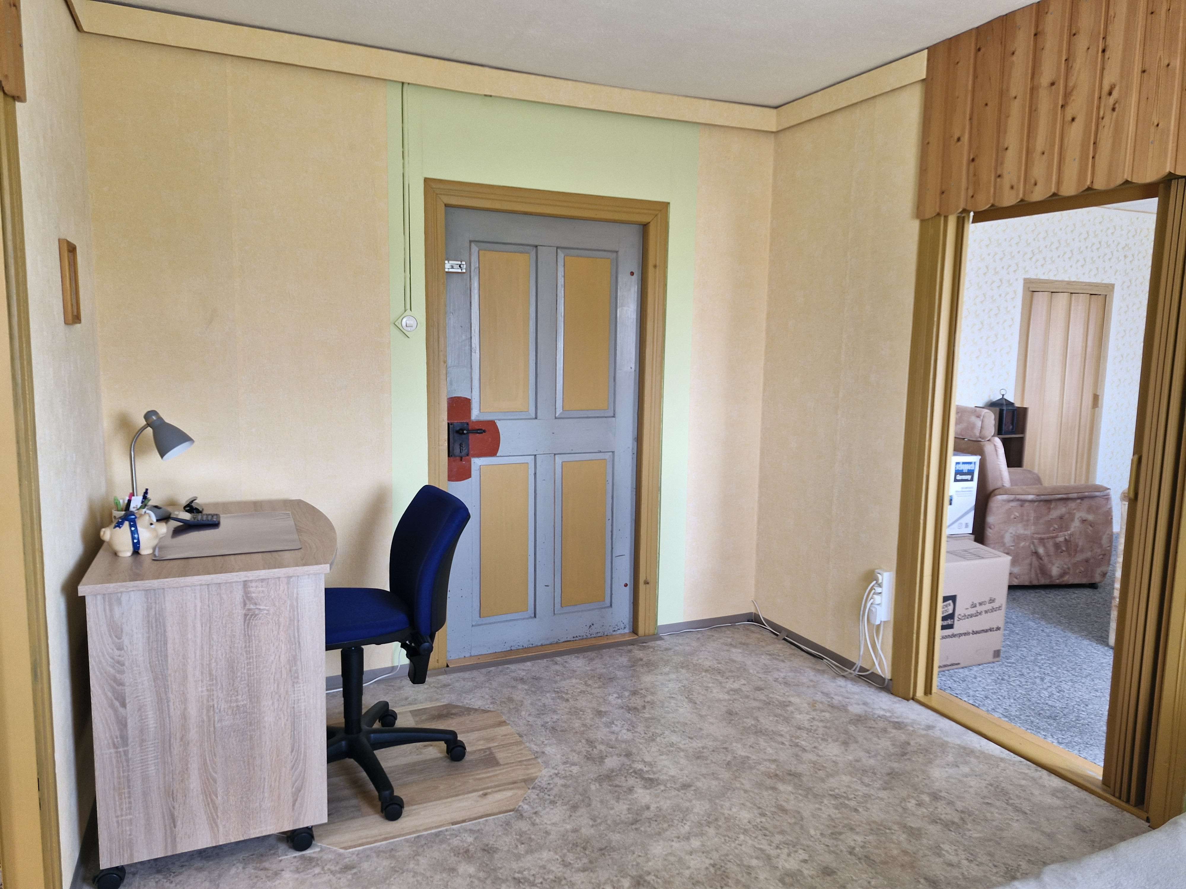 Auf der rechten Seite steht Ihnen ein weiterer Abstellraum, beispielsweise für Lebensmittel oder Haushaltsutensilien, zur Verfügung. Vom Flur aus erreichen Sie außerdem die Küche sowie ein Durchgangszimmer, das sich ideal als Gästezimmer oder Büro eignet. Von hier aus gelangen Sie in das helle und freundliche Wohnzimmer mit angrenzendem Kinderzimmer sowie in das gegenüberliegende Schlafzimmer.