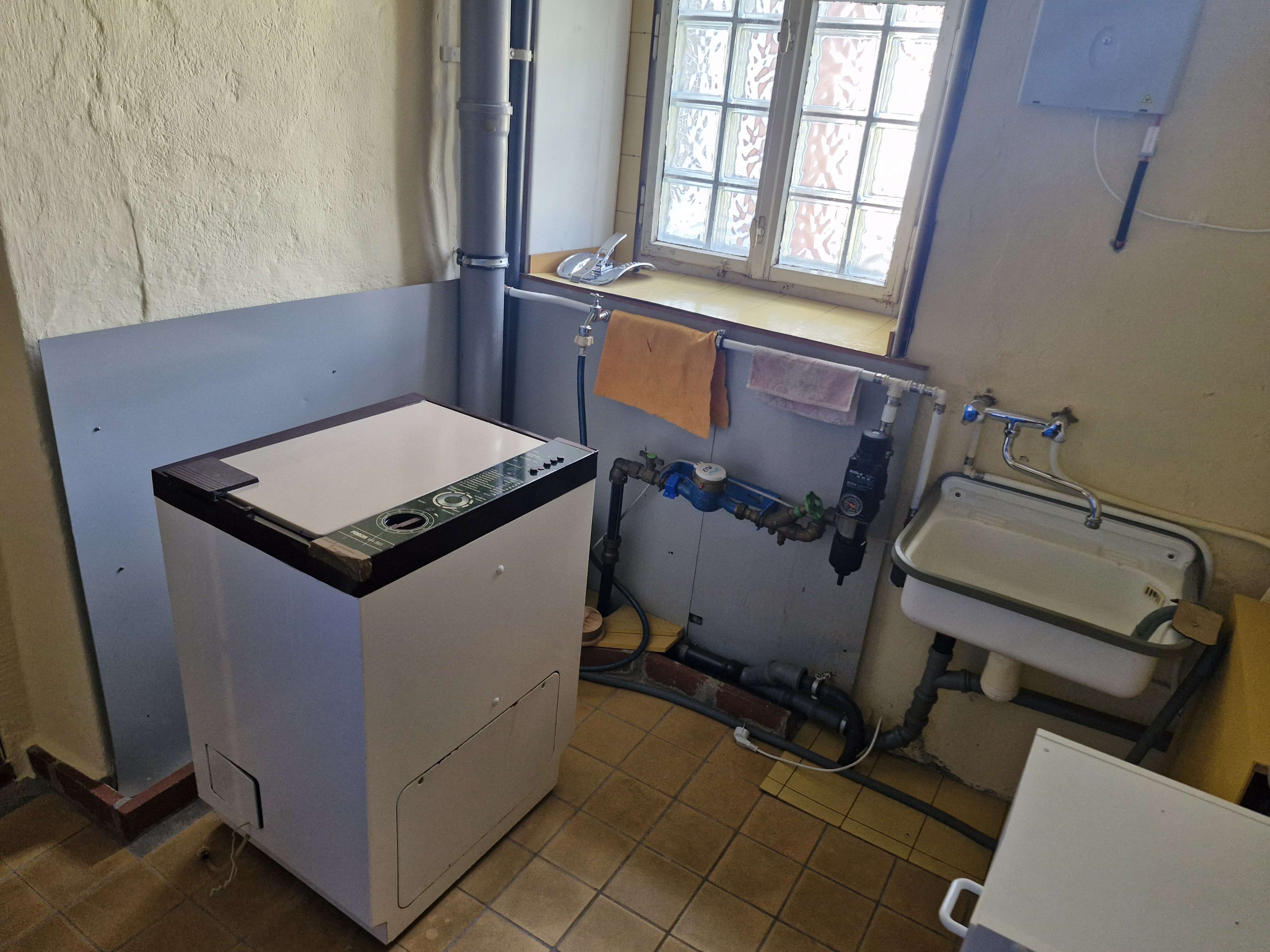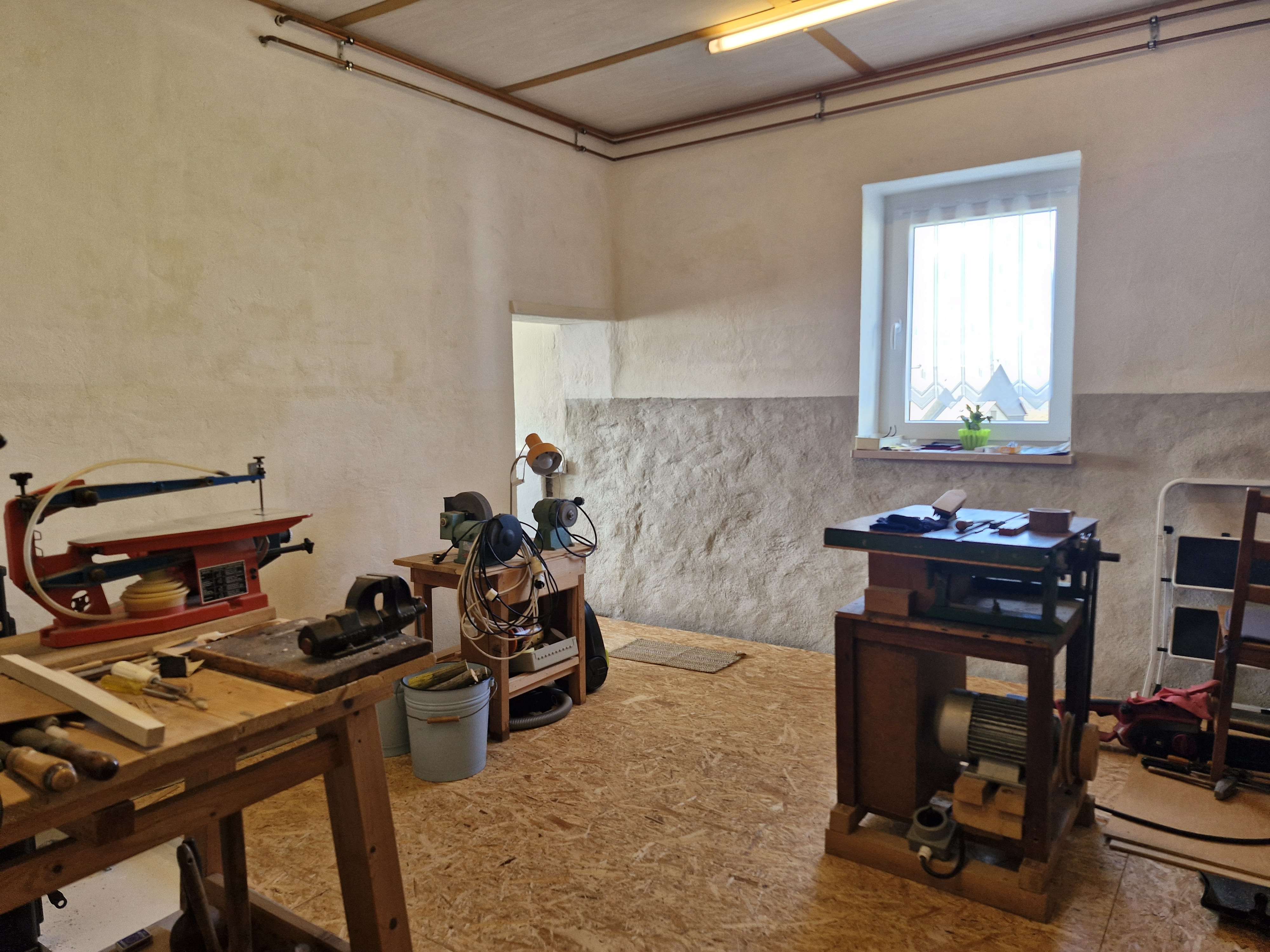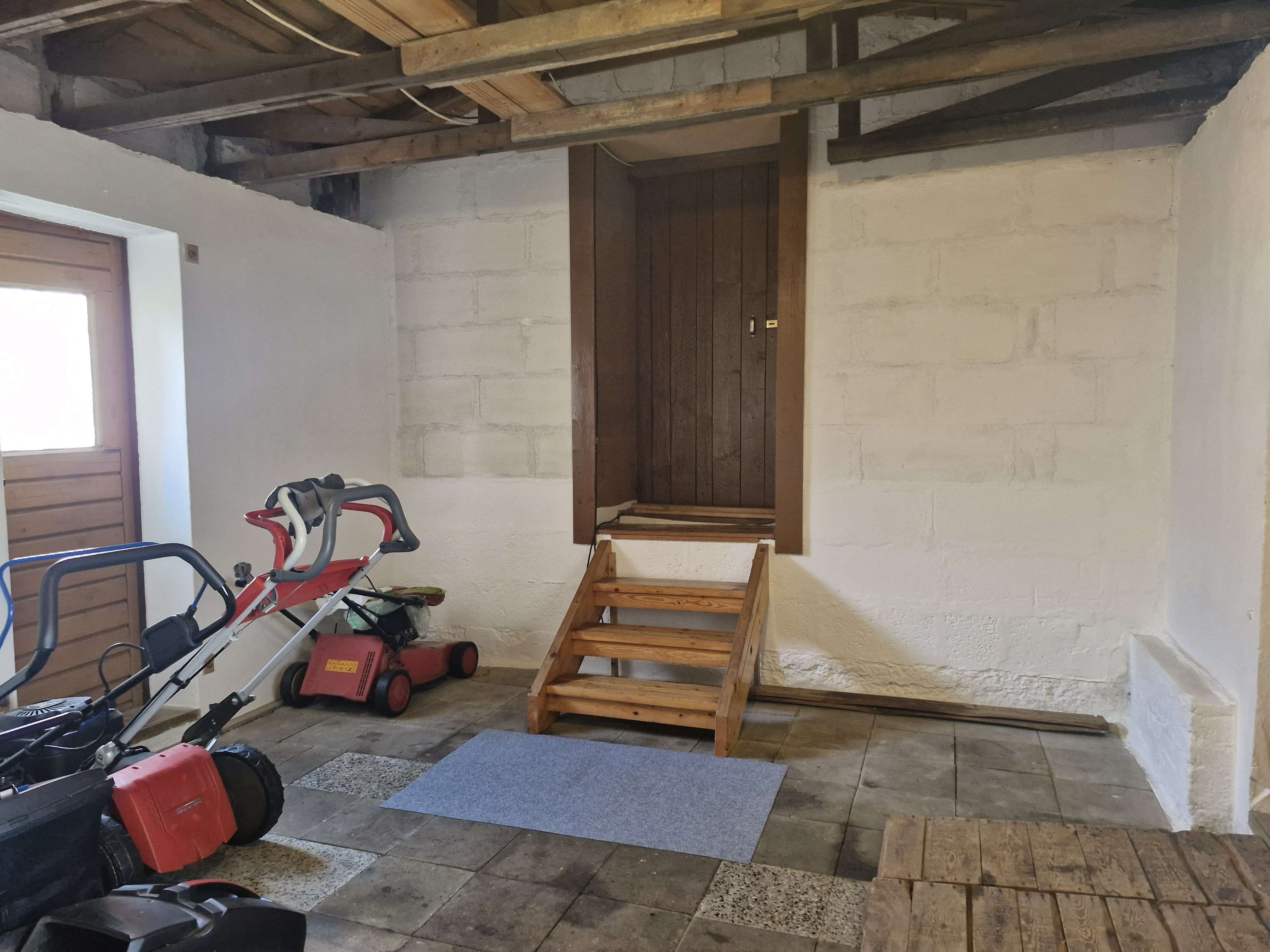 Weiterhin befinden sich im Erdgeschoss ein Waschhaus mit Anschlussmöglichkeiten für Waschmaschine und Trockner sowie die Öl-Heizung (Baujahr 1998). Die Öltanks mit einem Fassungsvermögen von ca. 4.000 Litern sind in einem separaten Raum untergebracht. Ergänzt wird das Raumangebot durch eine geräumige Werkstatt mit Kaminofen. Zudem besteht vom Flur aus Zugang zu einem kleinen Gewölbekeller, der ausschließlich als Lagerfläche genutzt wird. Eine weitere Tür führt in die angrenzende Scheune, die viel Platz für Gartengeräte und weitere Utensilien bietet und zudem eine Garage integriert.