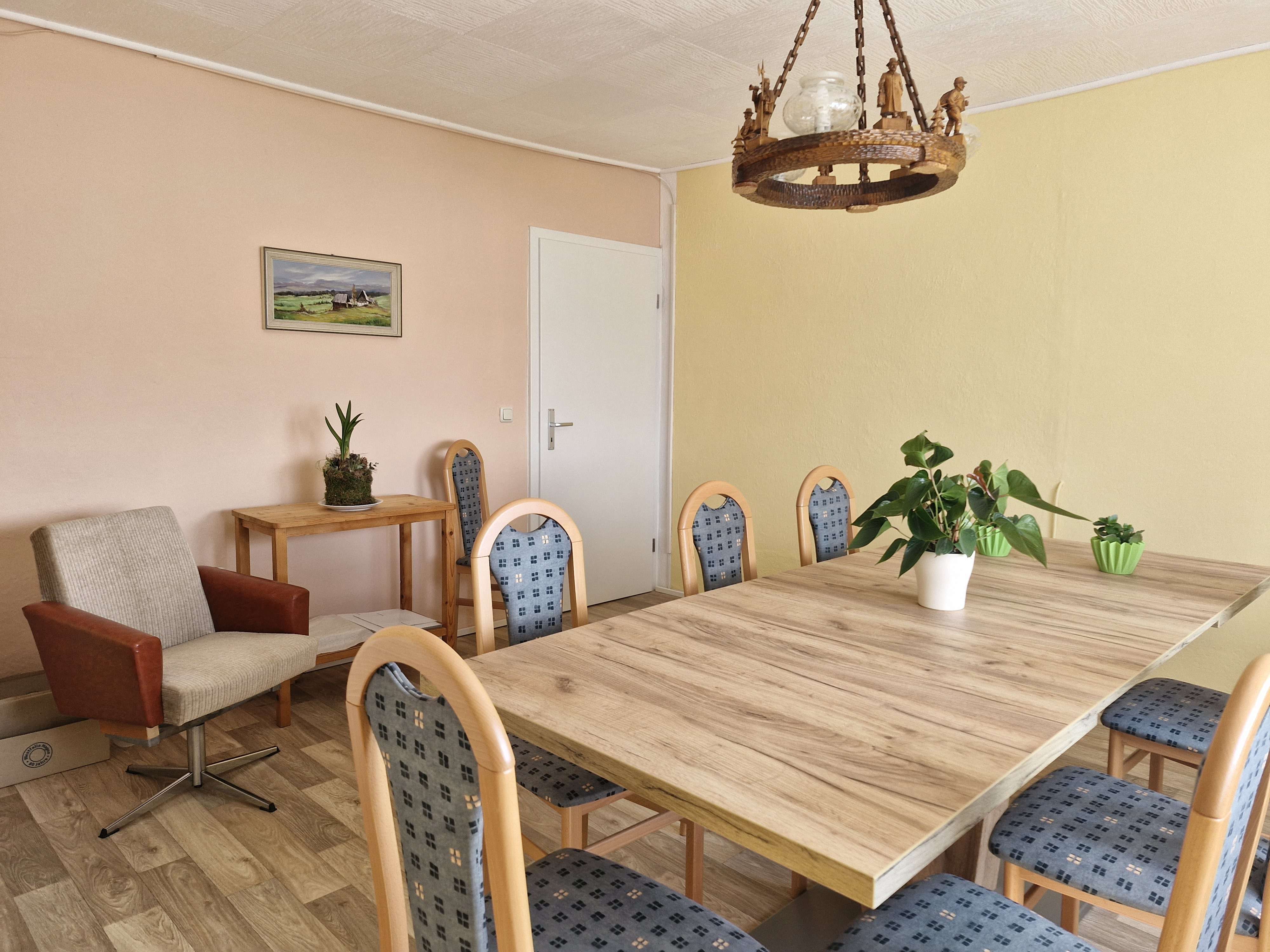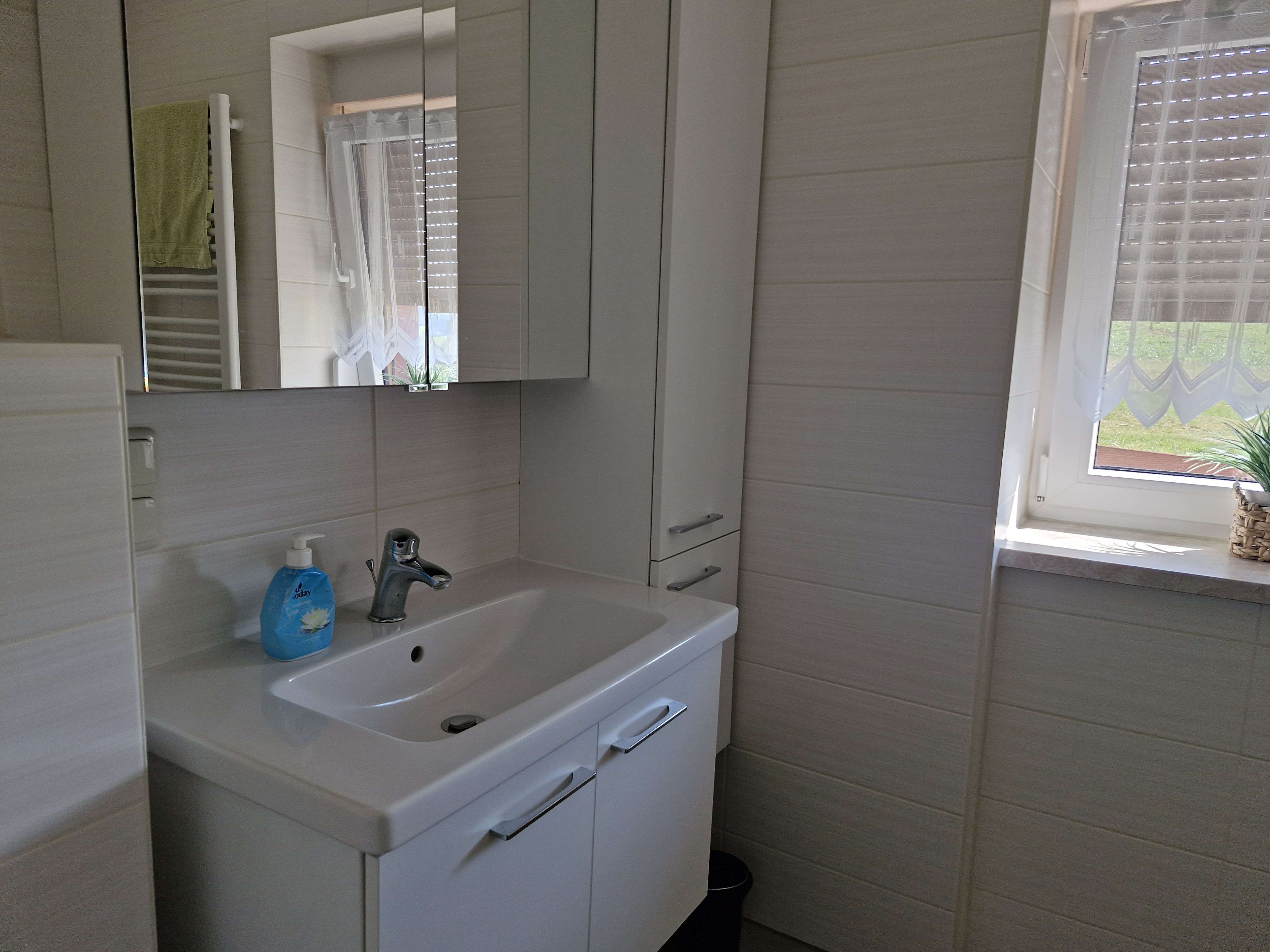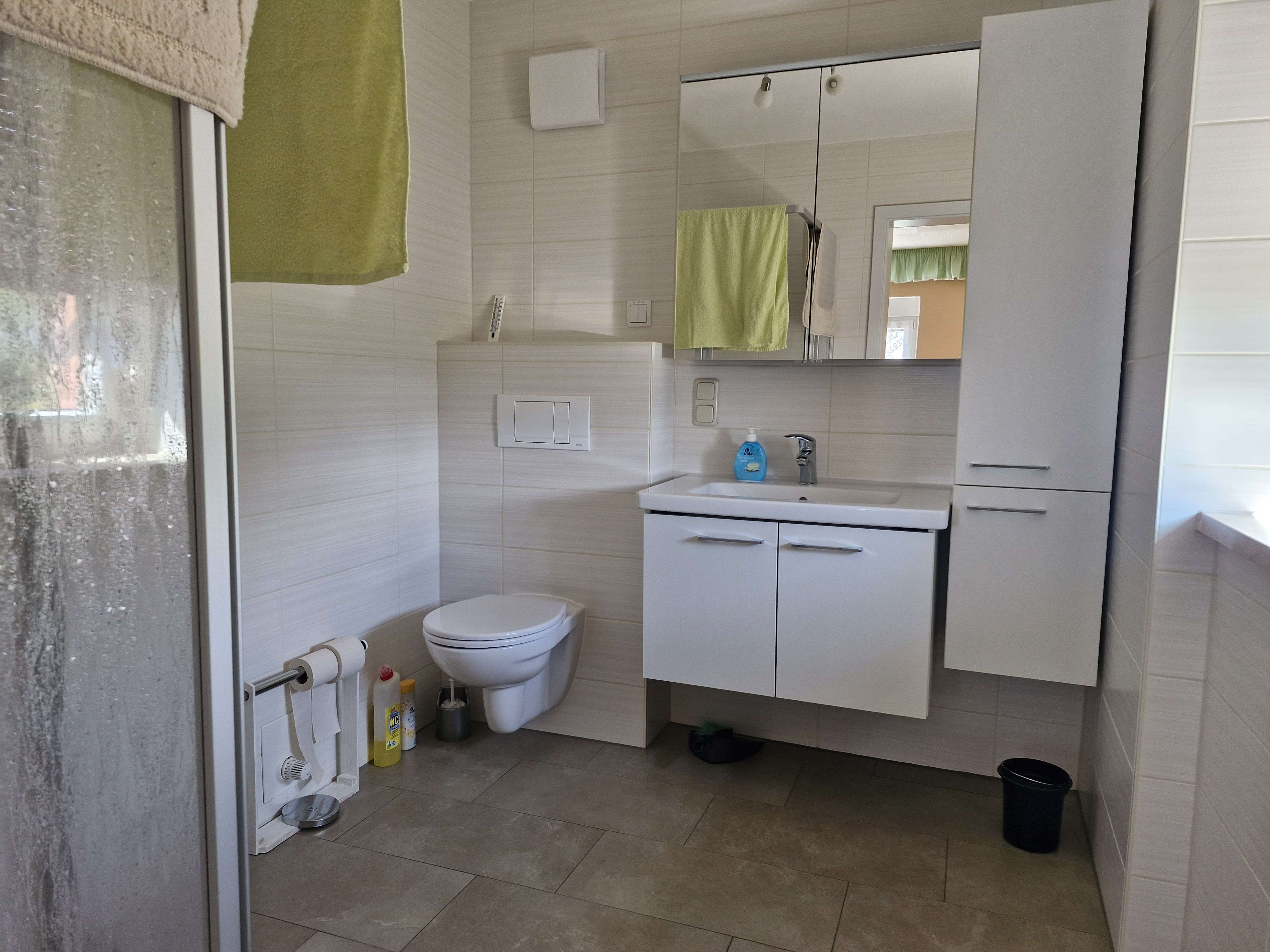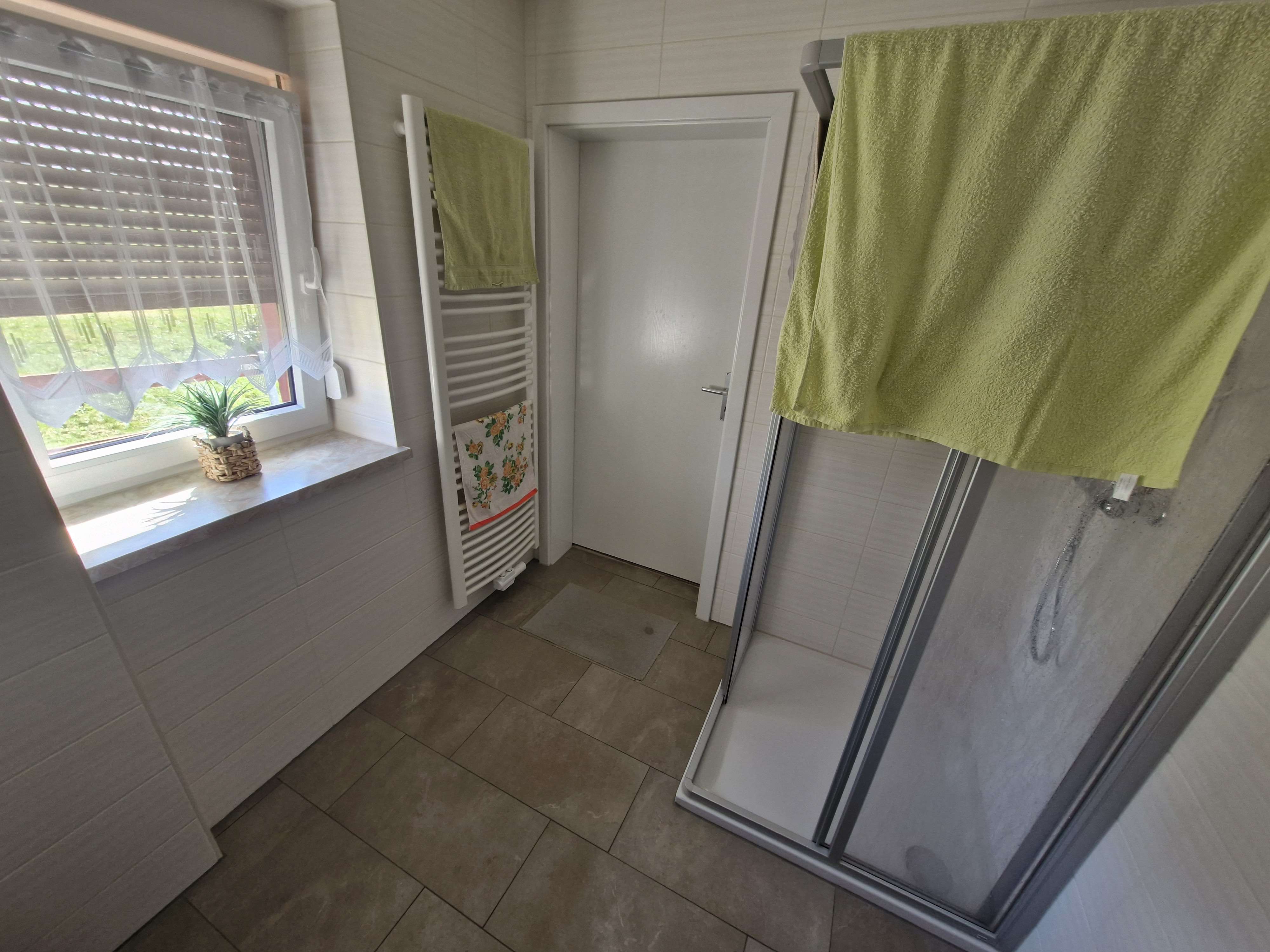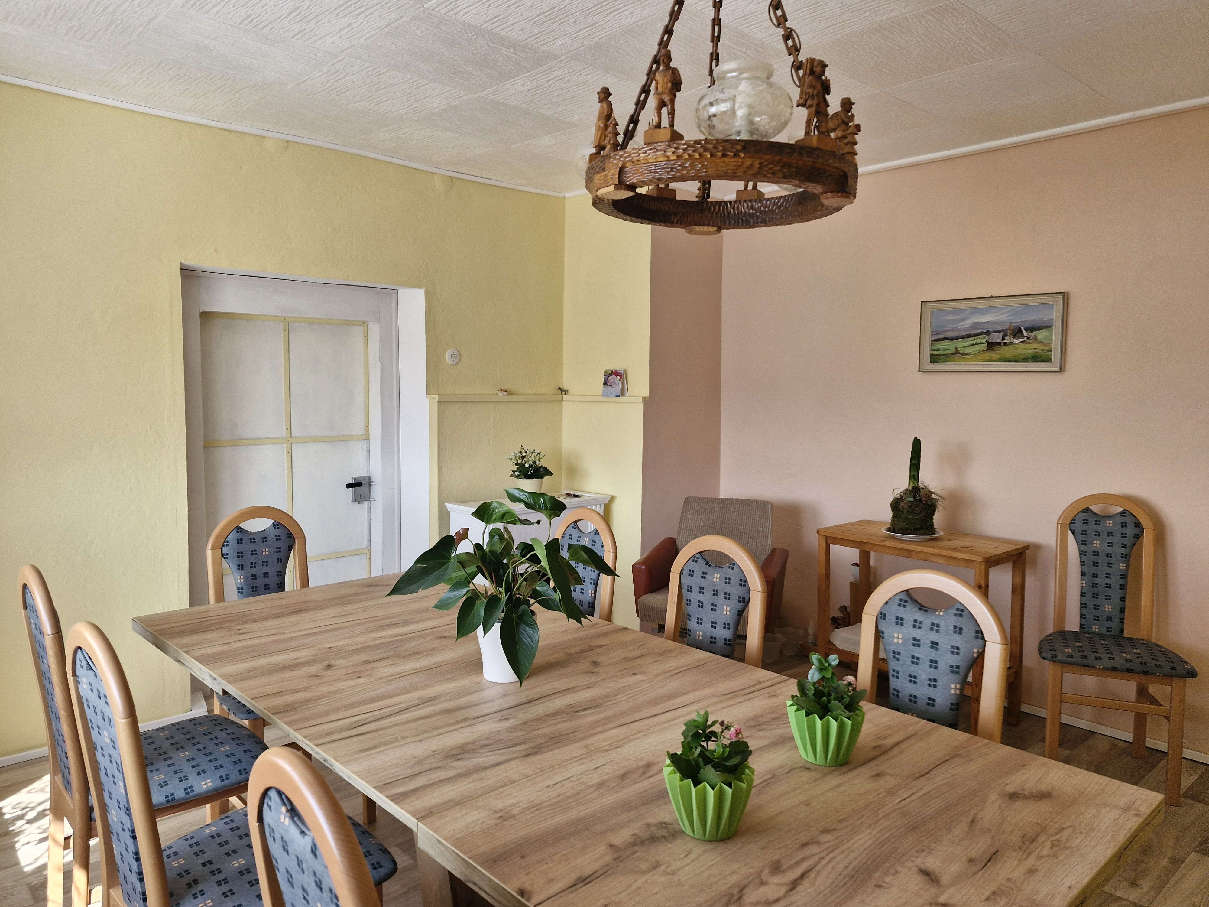 Sie betreten das Haus und gelangen zunächst in den Eingangsbereich. Auf der linken Seite befindet sich ein praktischer Abstellraum, während Sie auf der rechten Seite in den Flur des Erdgeschosses gelangen. Von hier aus erreichen Sie auf der rechten Seite das großzügige Esszimmer, welches sich ideal für Familienfeiern oder gesellige Abende eignet. Daran anschließend befindet sich das im Jahr 2018 sanierte Badezimmer mit Fußbodenheizung. Dieses ist ausgestattet mit Dusche, Waschtisch, WC sowie einem Handtuchheizkörper.